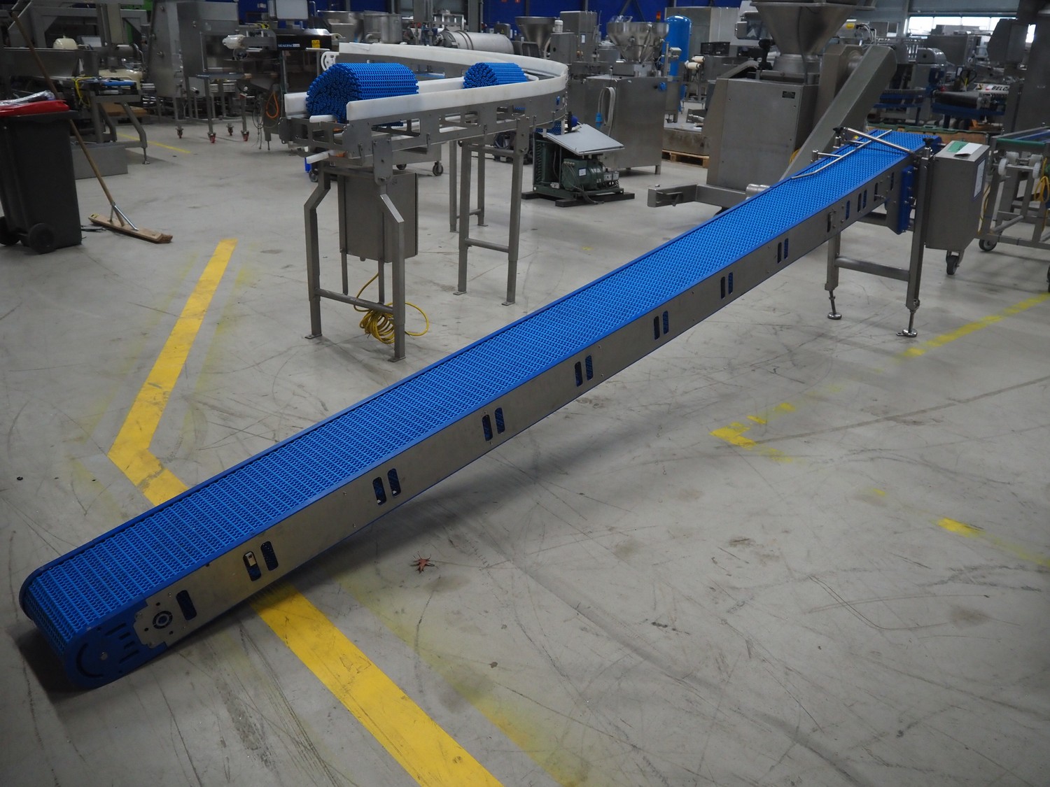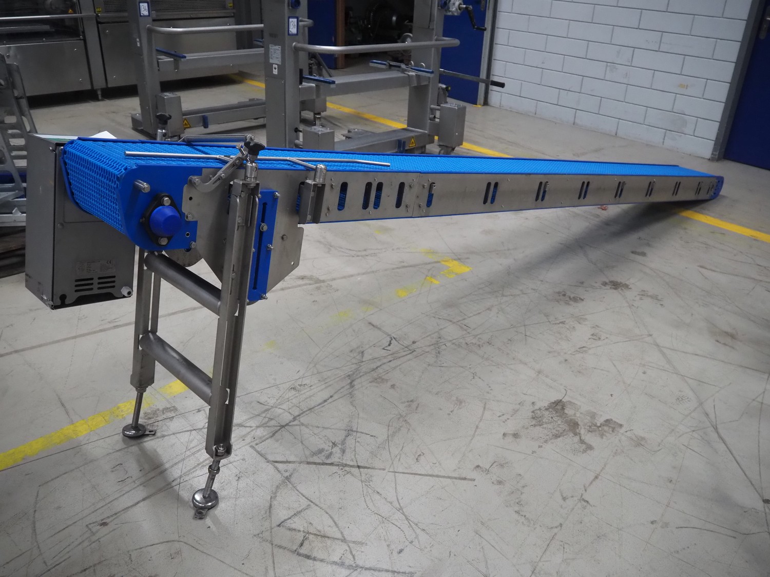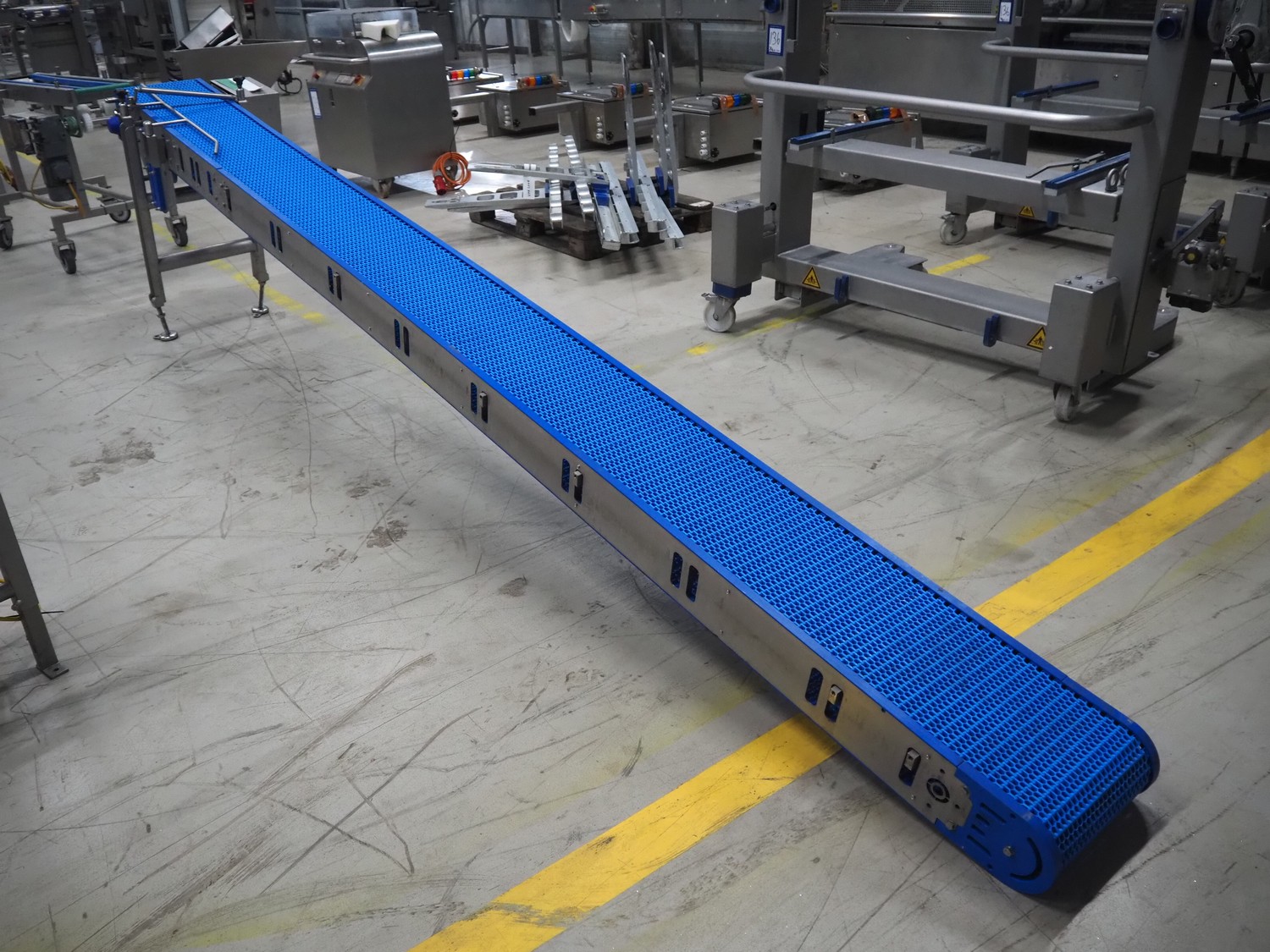 Marvu transport belt, type: 250/324, serial number: 10075625, year of construction: 09-2019, 230-400 V, 50 Hz, 3.16-1.82 A, 0.62 kW, s/s frame, plastic mesh belt, belt width: 300 mm, total dimensions: 4000 mm x 650 mm x 1000 mm.
