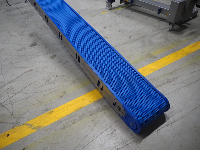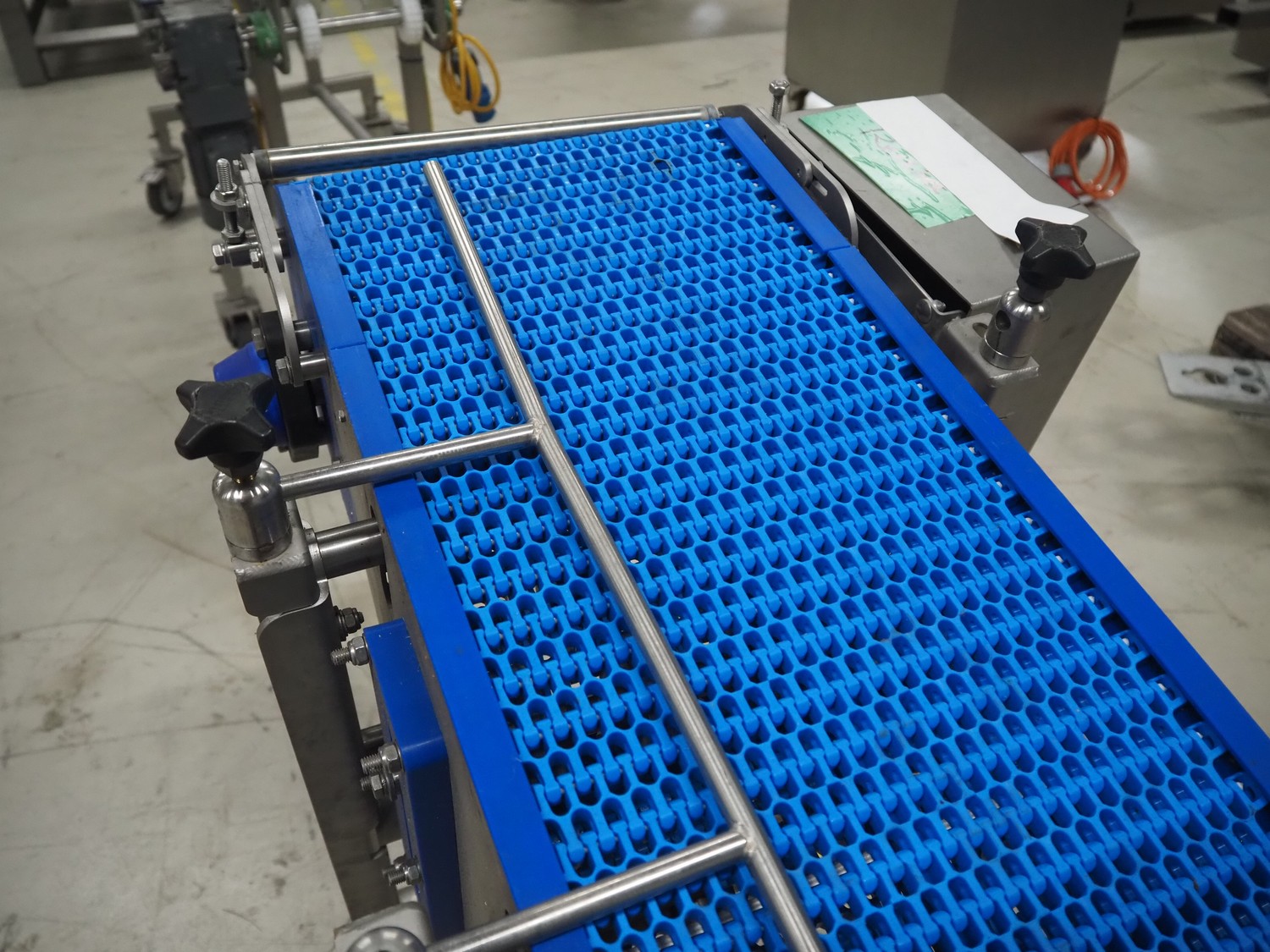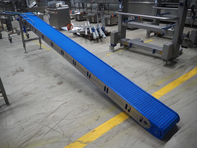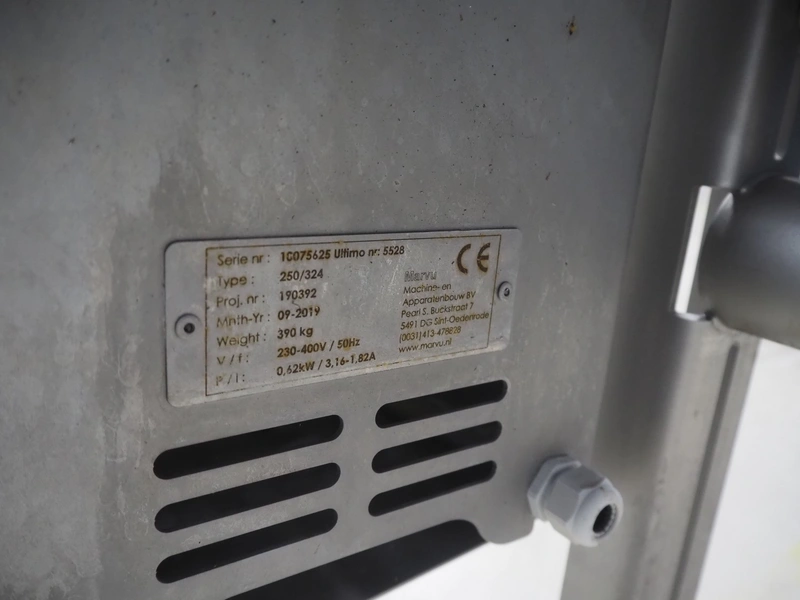 Marvu transport belt, type: 250/324, serial number: 10075625, year of construction: 09-2019, 230-400 V, 50 Hz, 3.16-1.82 A, 0.62 kW, s/s frame, plastic mesh belt, belt width: 300 mm, total dimensions: 4000 mm x 650 mm x 1000 mm.