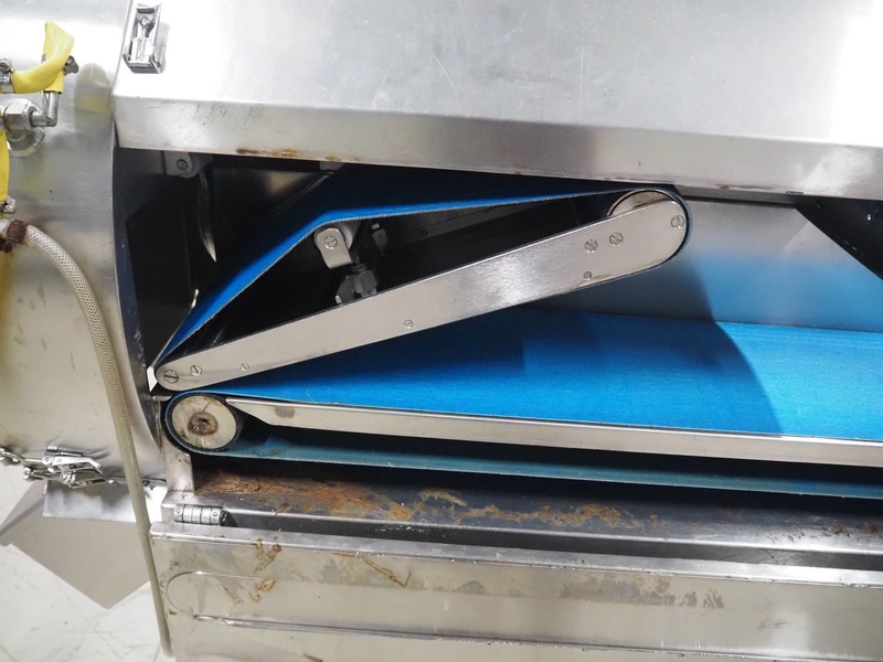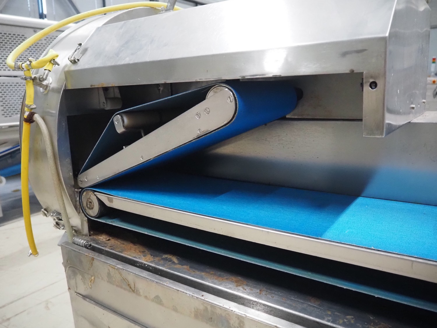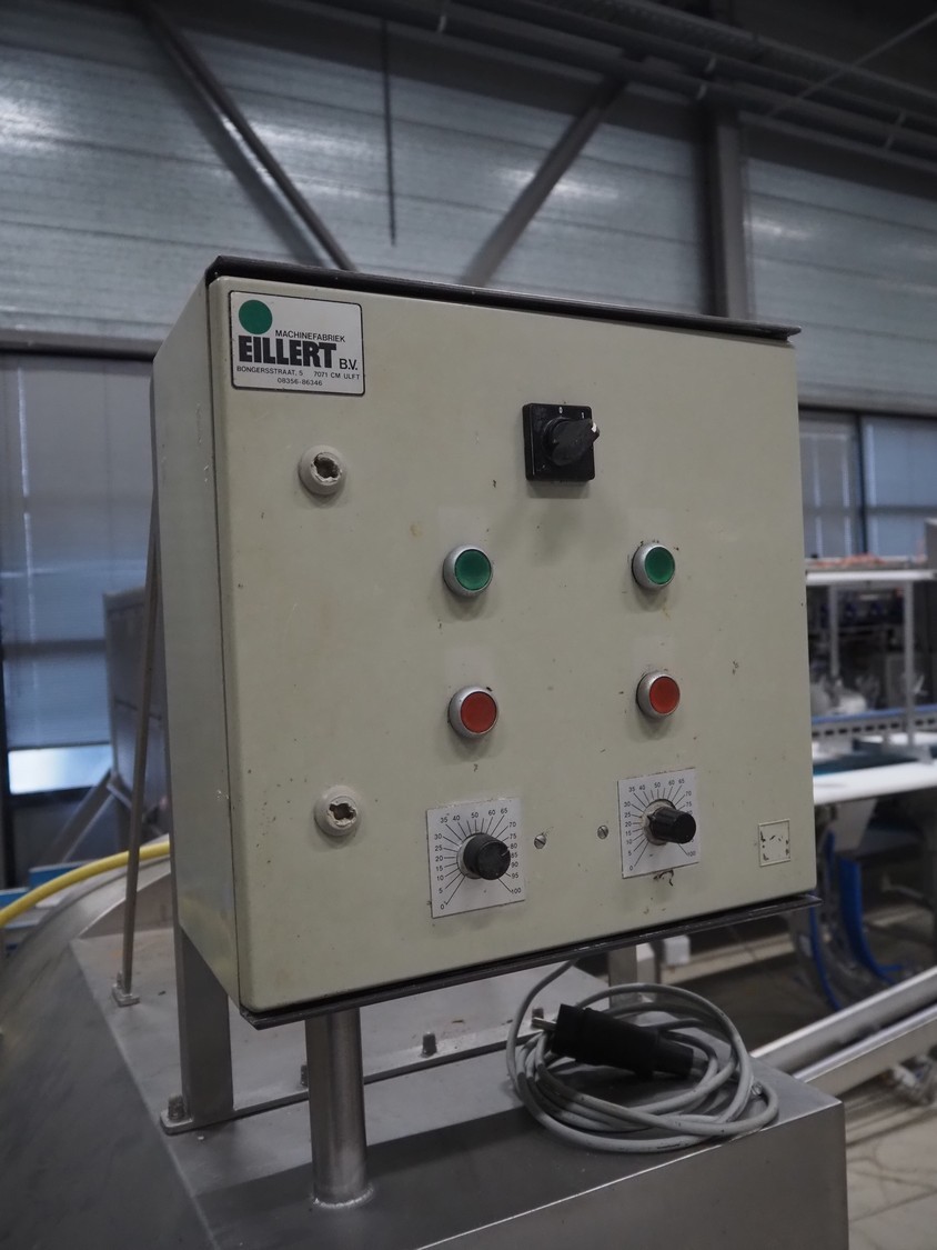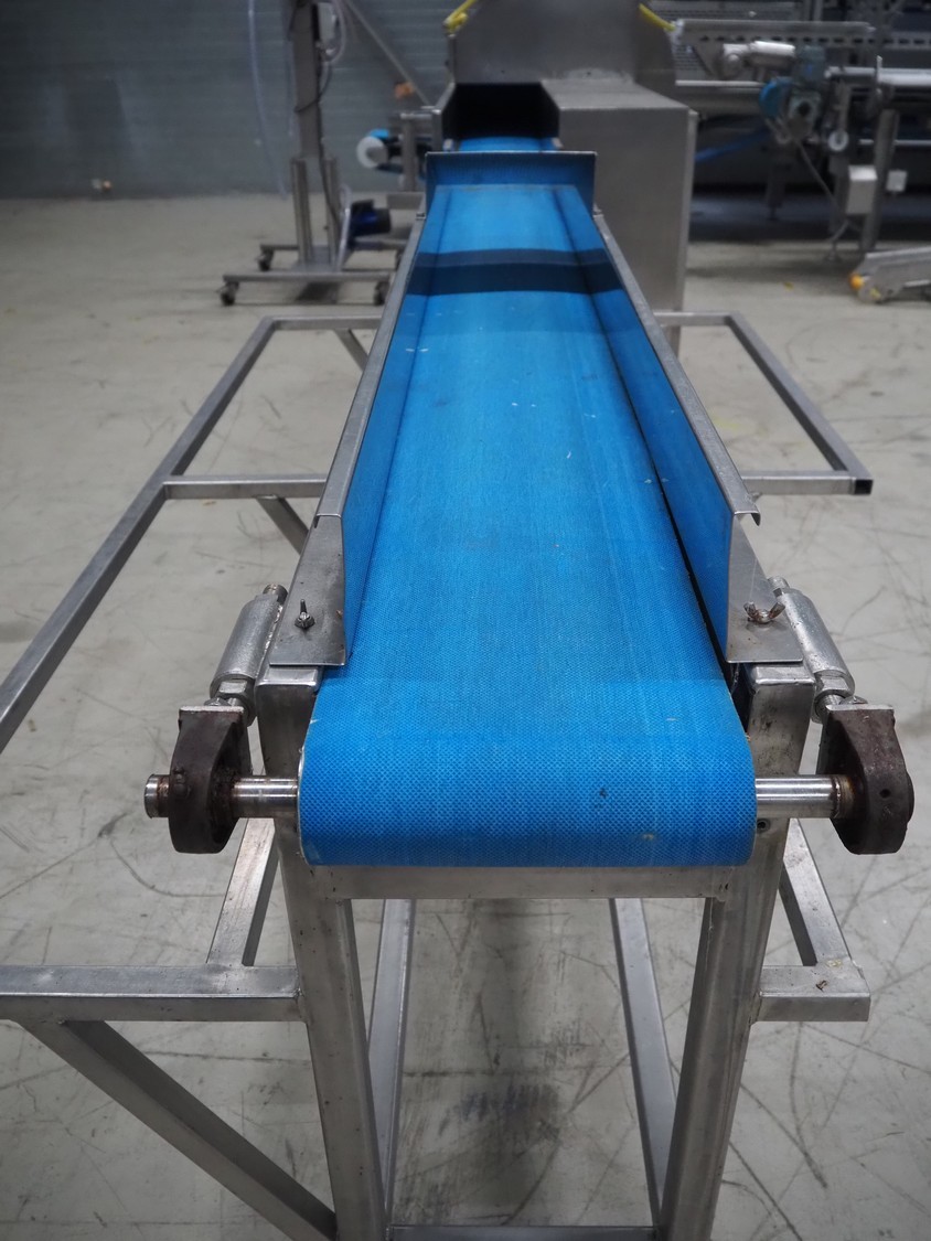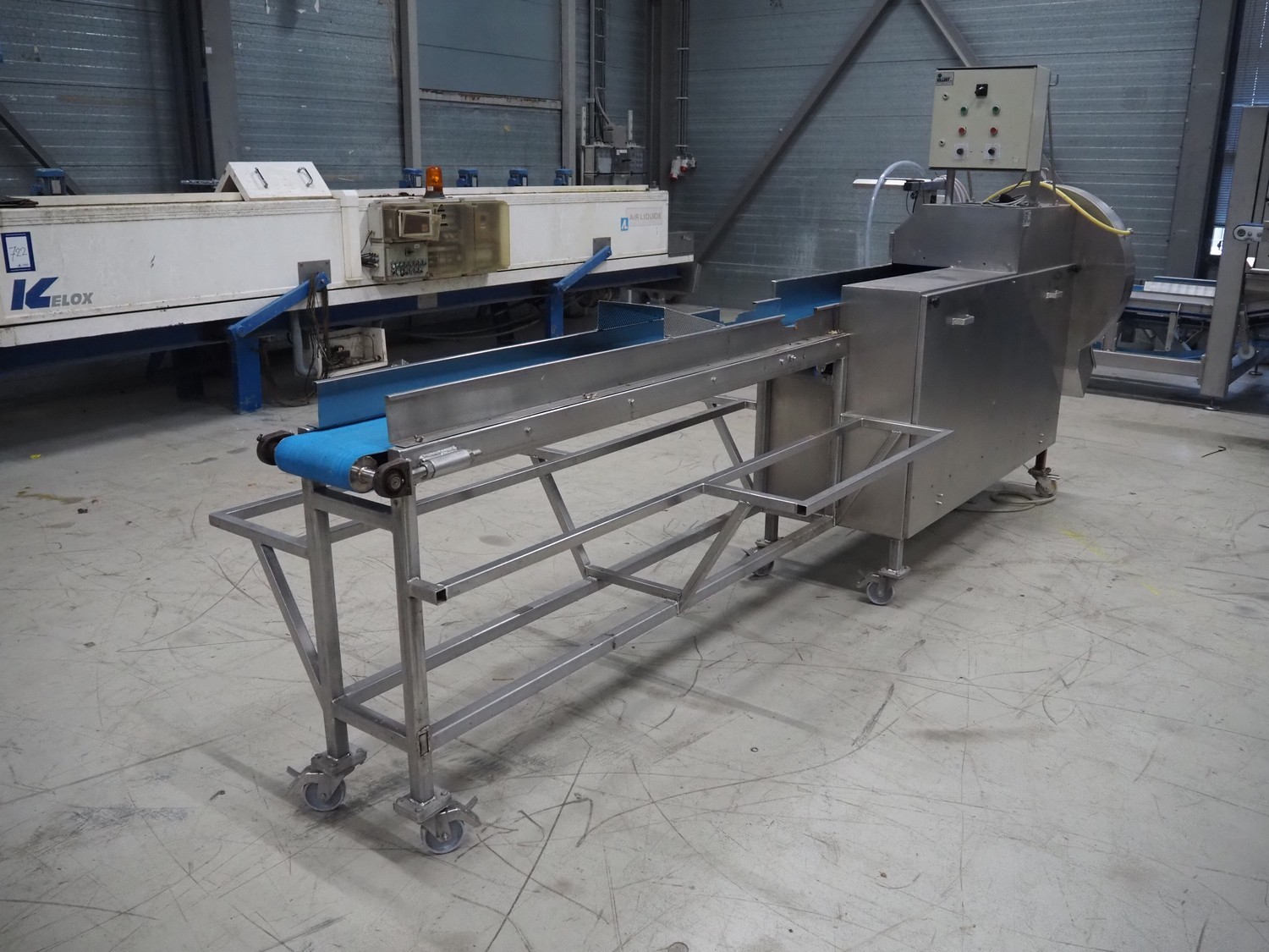 Eillert mobile vegetable slicer, type: G3300, serial number: 382-9037, 220 V, 4.2 A, plastic belt, belt width: 250 mm, total dimensions: 4170 mm x 1140 mm x 1900 mm.