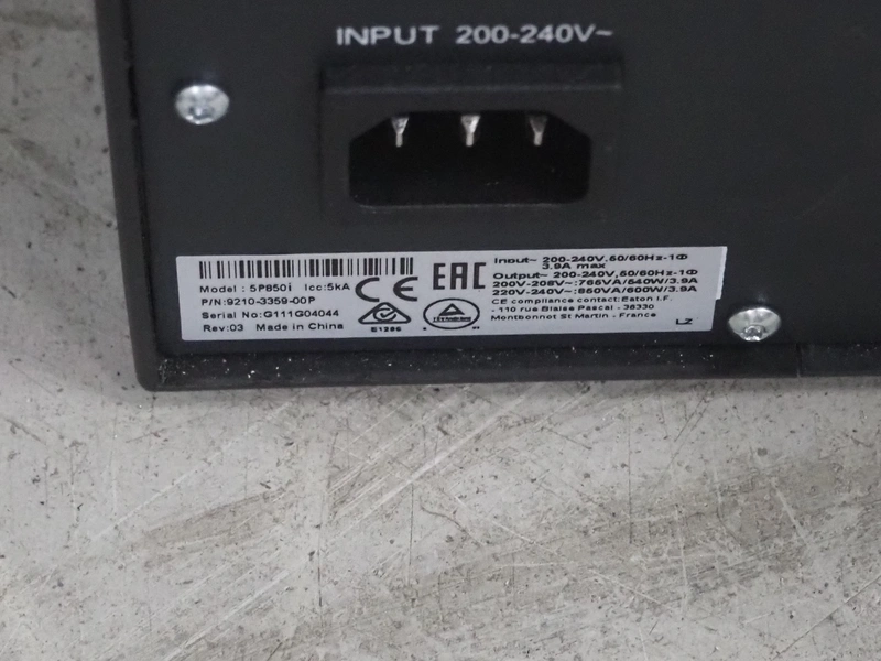 Eaton uninterruptible power supply, model: 5P850i, serial number: G111G04044, 200-240 V, 50/60 Hz, dimensions: 350 mm x 150 mm x 230 mm.