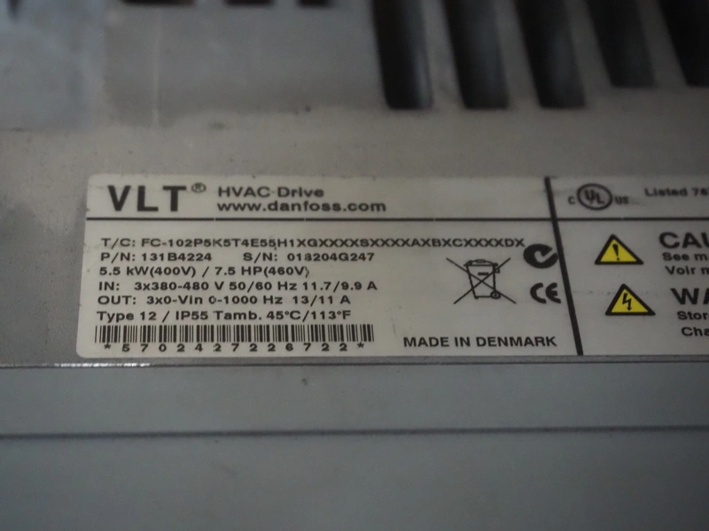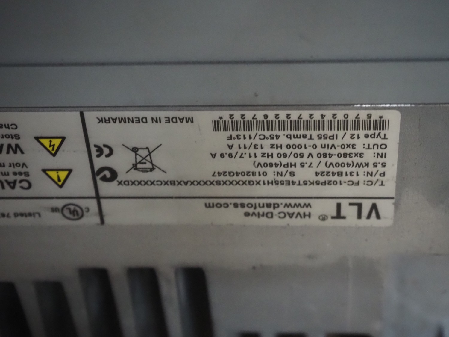 Danfoss frequency converter, model: VLT, serial number: 08204G247, 380/480 V, 3 Ph, 50/60 Hz, 11.7/9.9 A, dimensions: 250 mm x 200 mm x 450 mm.
