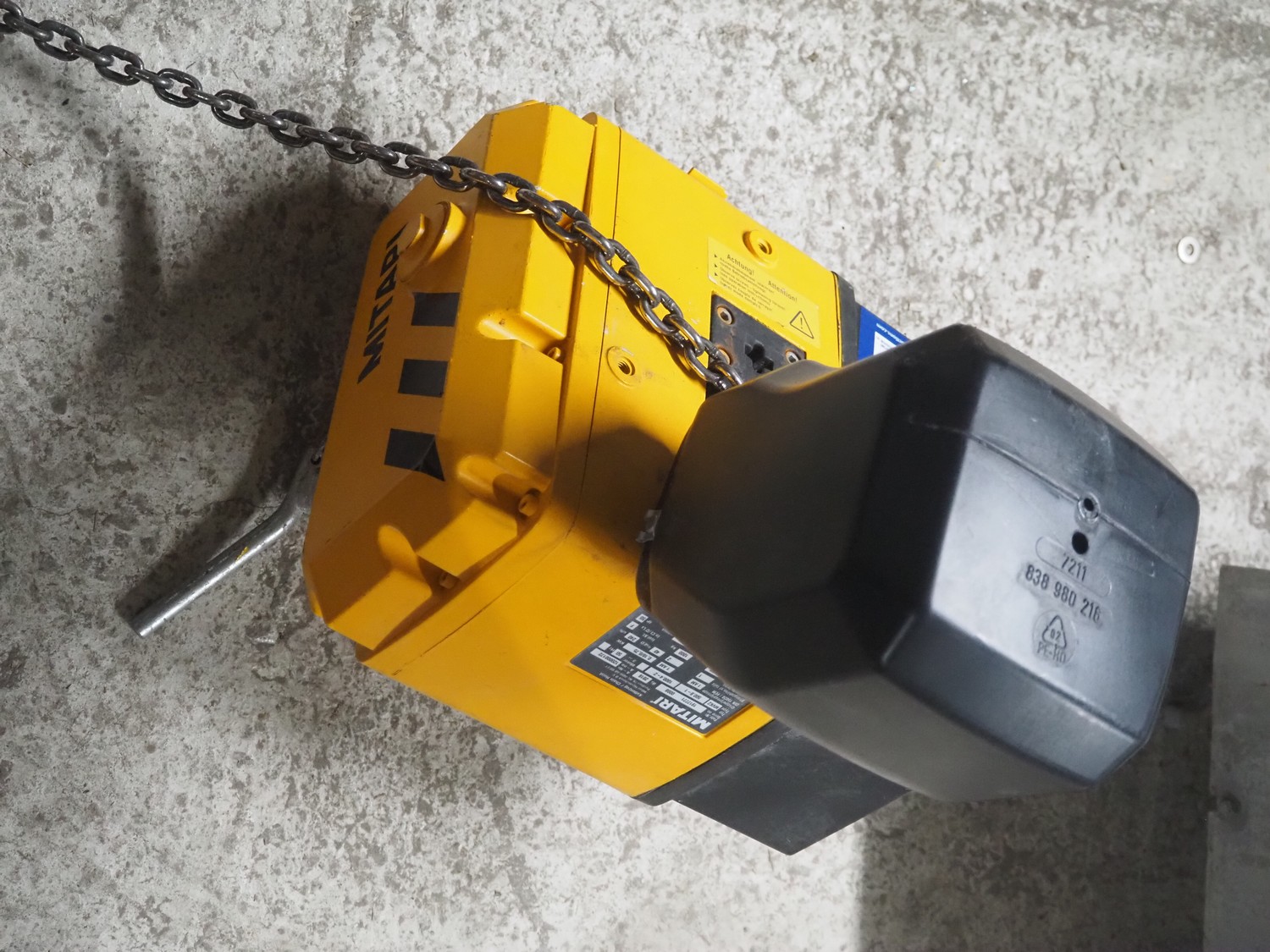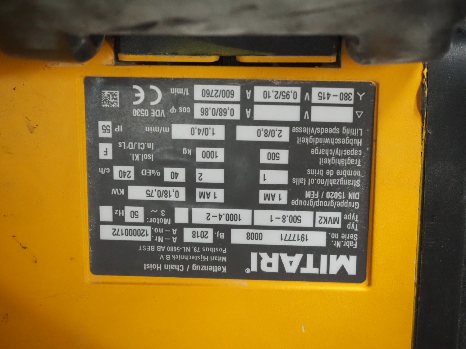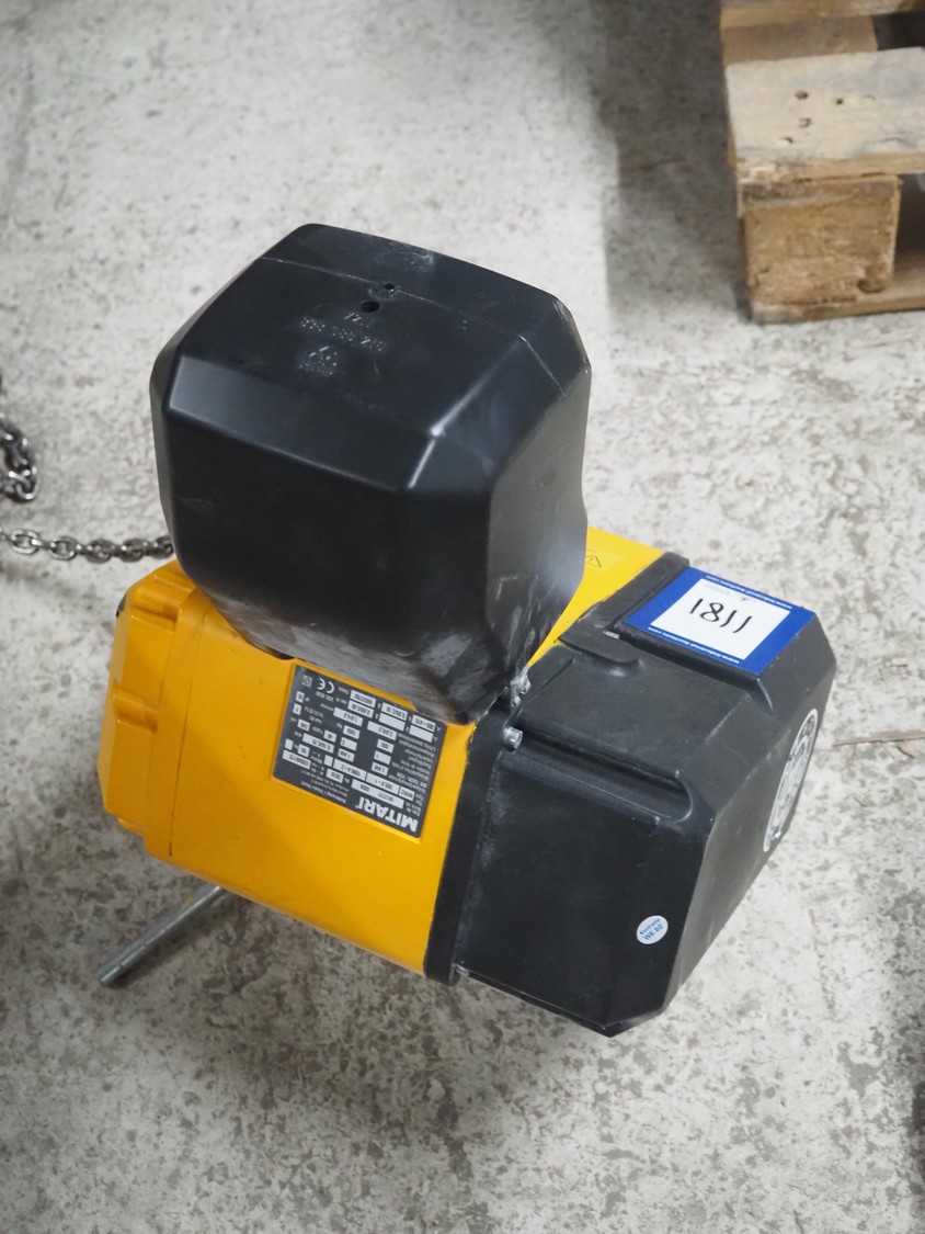 Mitari chain hoist, type: MVK2 500.8-1 1000.4-2, serial number: 1917771 0008, year of construction: 2018, 380/415 V, 3 Ph, 50 Hz, 0.95/2.10 A, 0.18/0.75 kW, capacity: 500/1000 kg, dimensions: 370 mm x 320 mm x 400 mm.