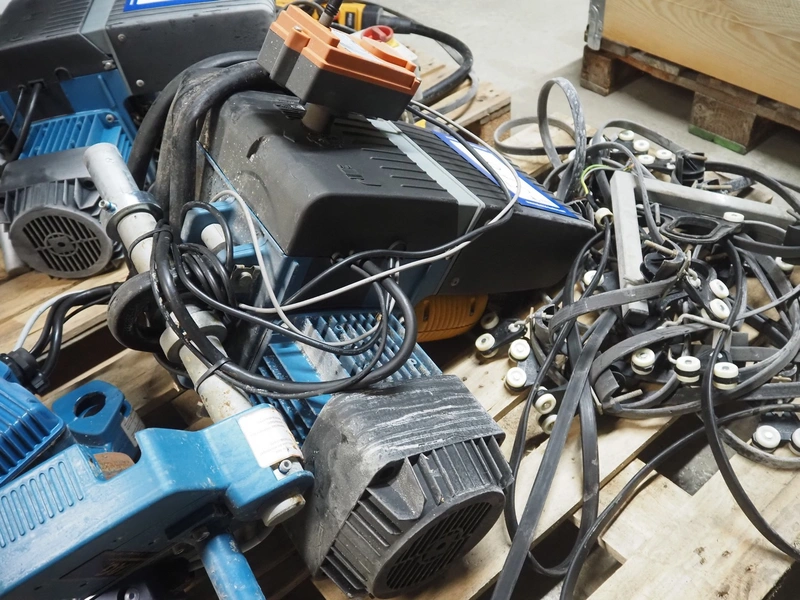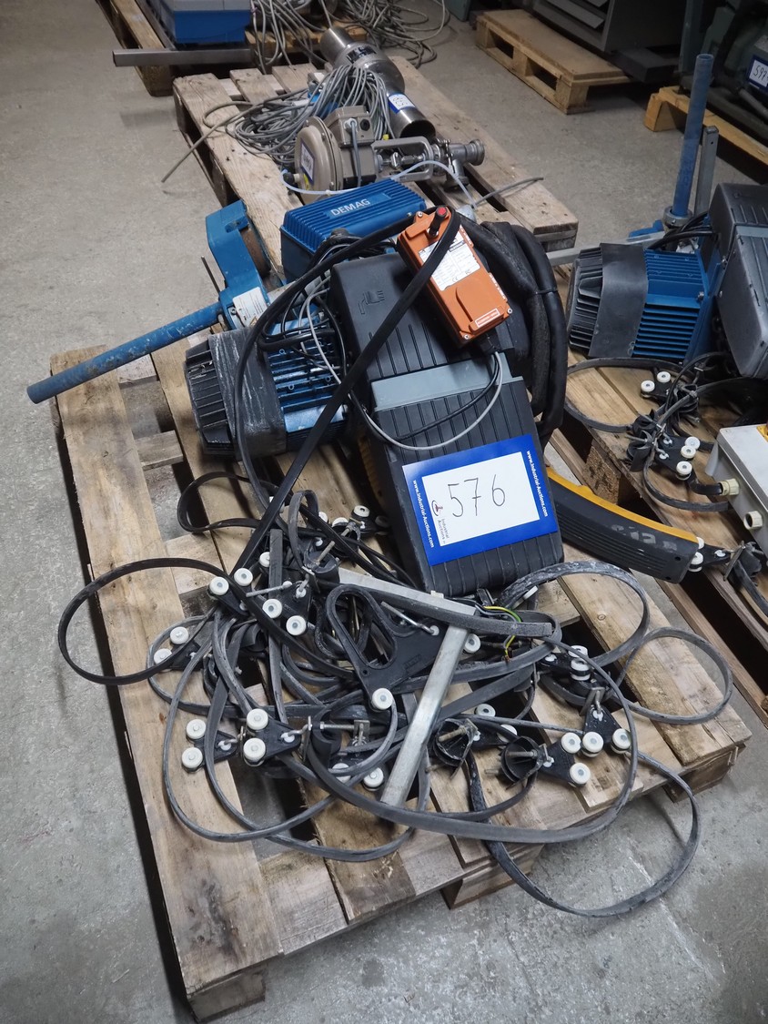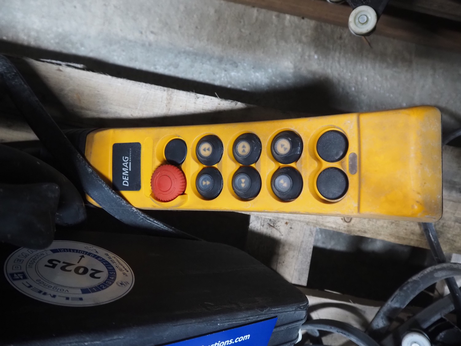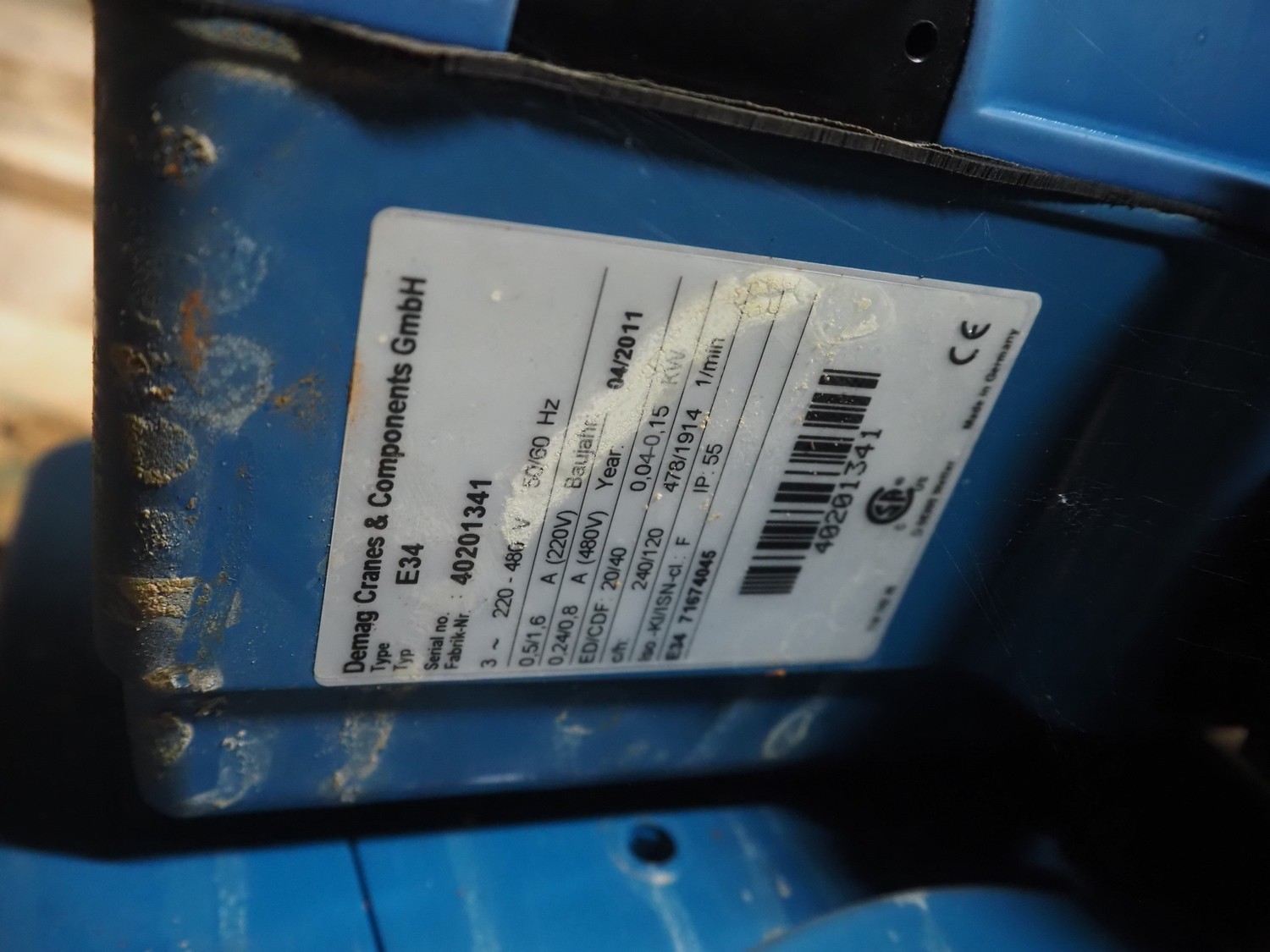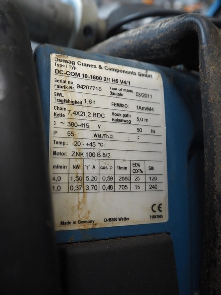 Demag electric chain hoists, type: DC-COM 10-1600 2/1 H5 V4/1, serial number: 94207718, year of construction: 03/2011, 380-415 V, 3 Ph, 50 Hz, capacity: 1600 kg, dimensions: 800 mm x 1200 mm x 600 mm.