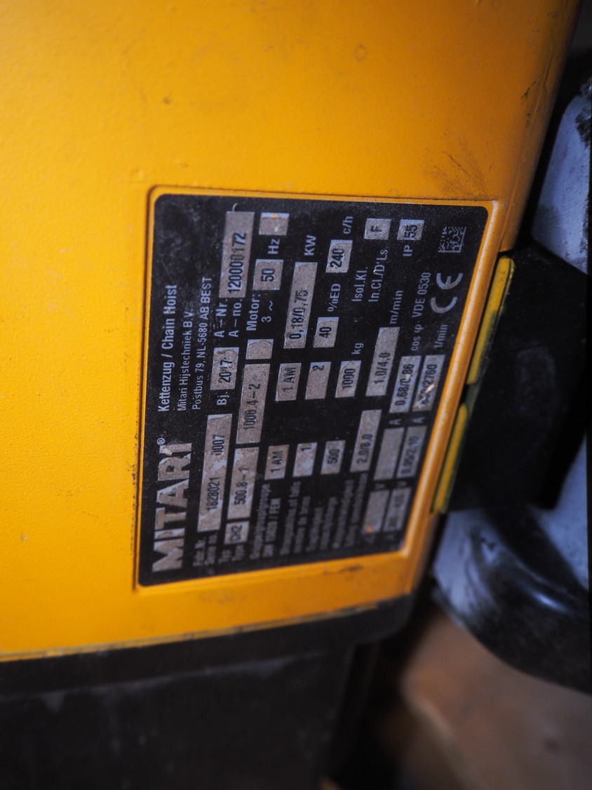 Mitari chain hoist, type: MVK2 500.8-1 1000.4-2, serial number: 1828021 0007, year of construction: 2017, capacity: 500/1000 kg with Kratos balancer.