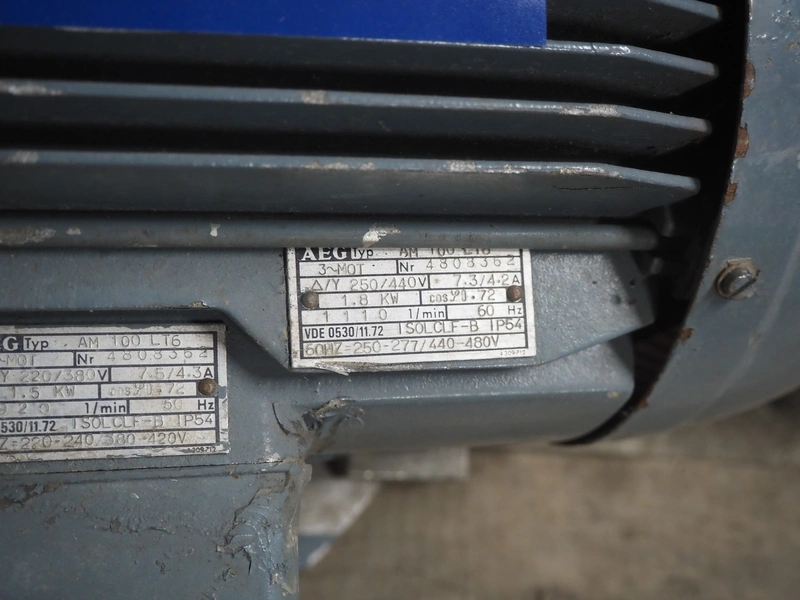 AEG motor, type: AM 100 LT6, number: 4808362, 220/380 V, 3 Ph, 50 Hz, 7.5/4.3 A, 1.5 kW, 920 rpm, dimensions: 400 mm x 300 mm x 200 mm.