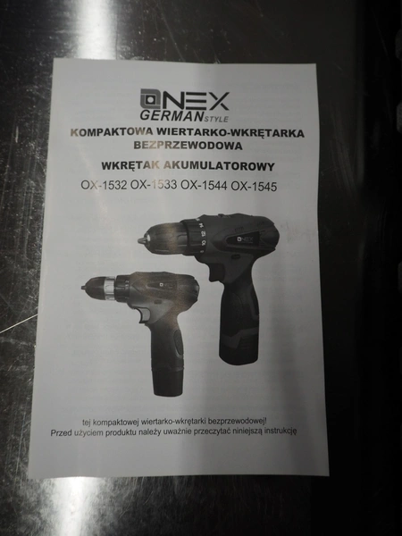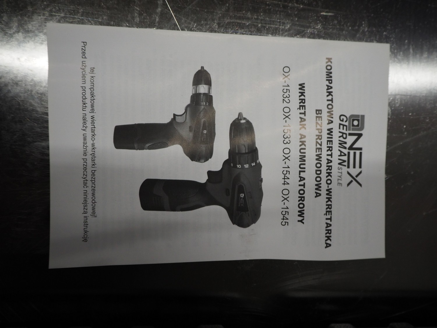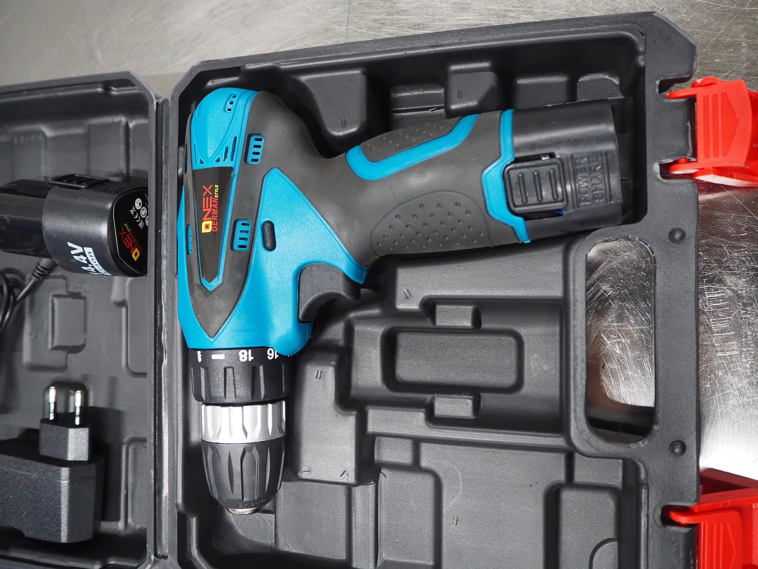 Onex cordless drill, model: OX-1532, 14.4 V, dimensions: 260 mm x 230 mm x 80 mm.