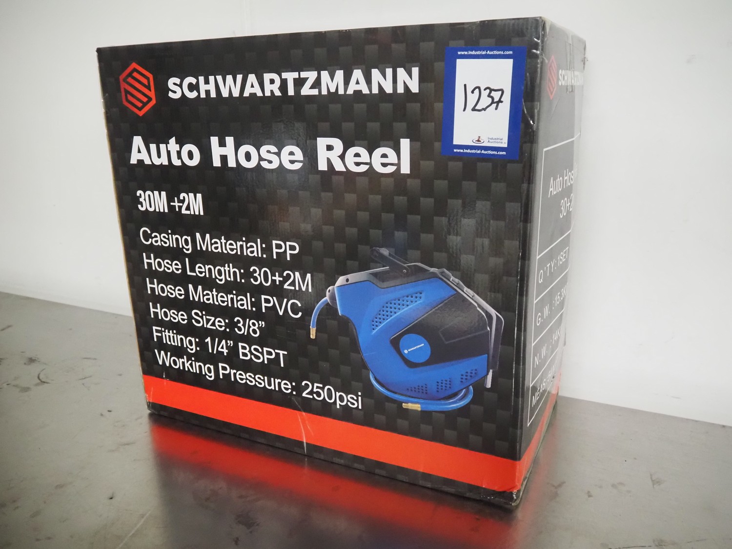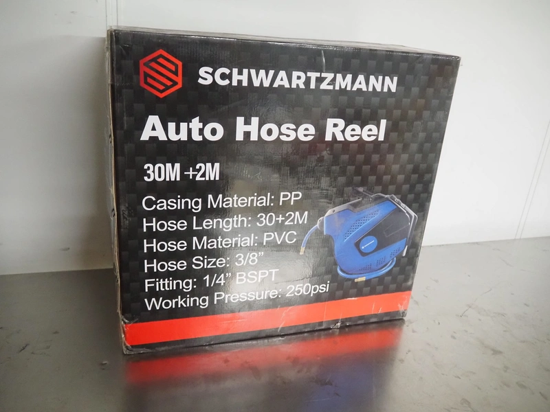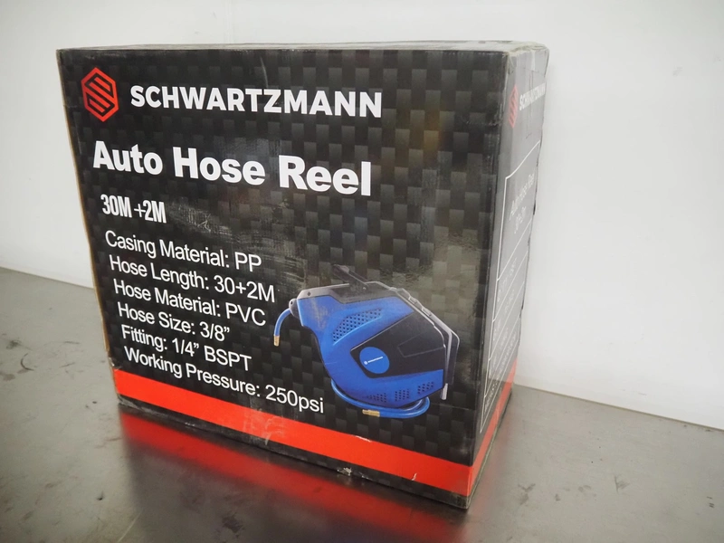 Schwartzmann retractable air hose, dimensions: 540 mm x 290 mm x 505 mm.