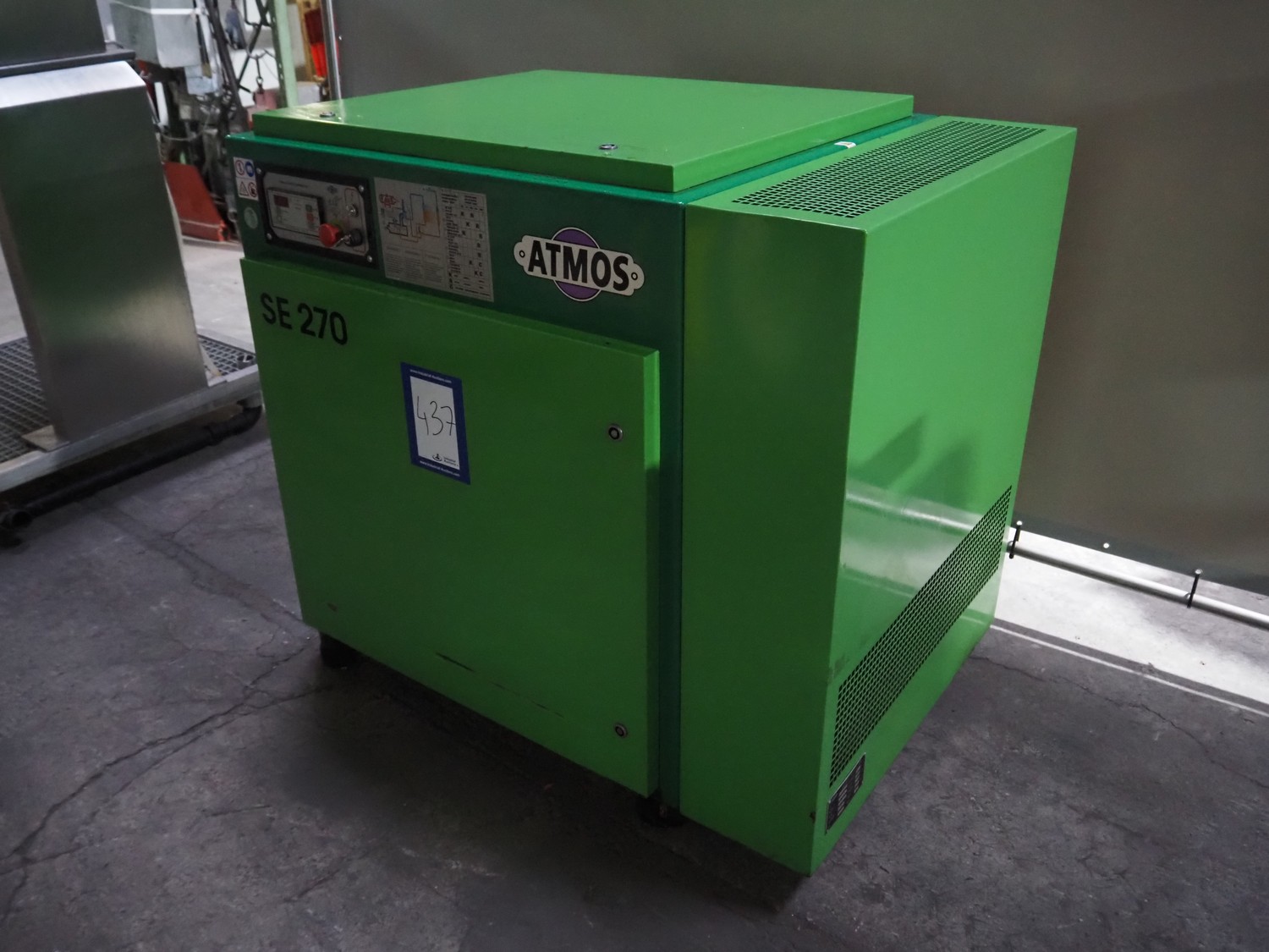 Atmos screw compressor, type: SE270, serial number: 82927, year of construction: 2006, 400 V, 50 Hz, weight: 820 kg, dimensions: 1330 mm x 980 mm x 1230 mm.