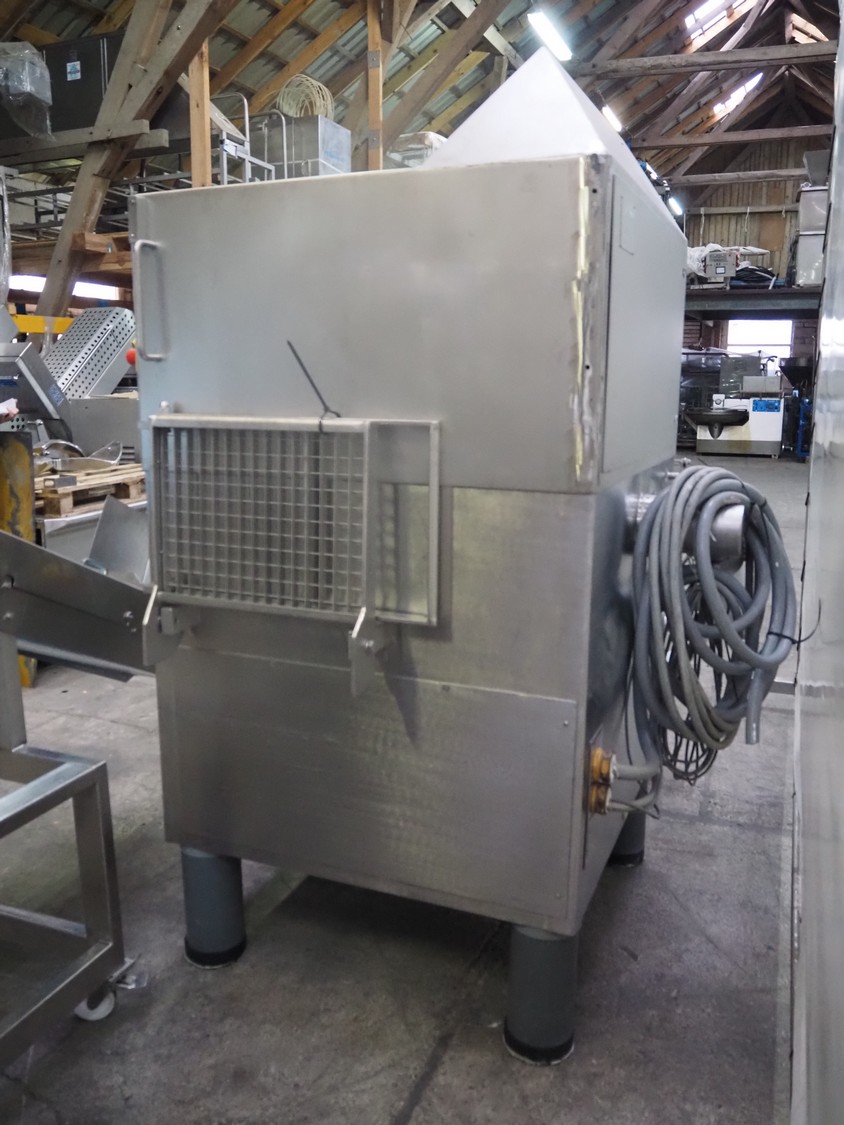 - Seydelmann mixer-grinder with lifter for 200 liter meat bins, type: MG160B, machine number: 92379-1, 380 V, 50 Hz, 70 A, plate diameter: 160 mm, dimensions: 2000 mm x 1700 mm x 2200 mm.