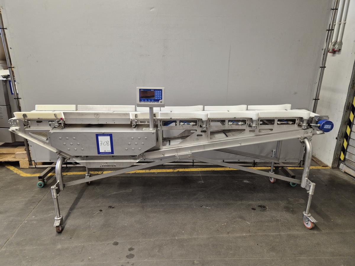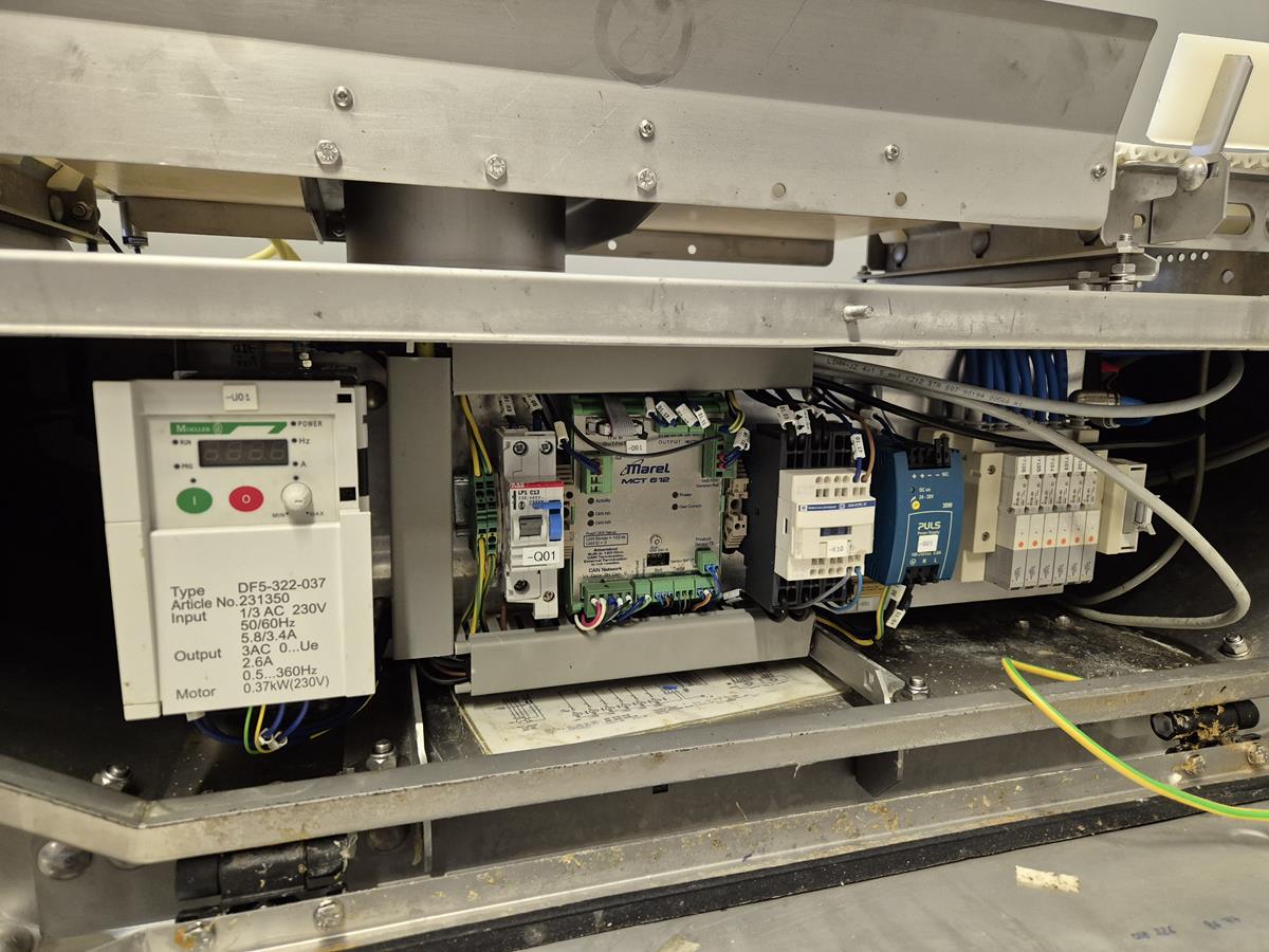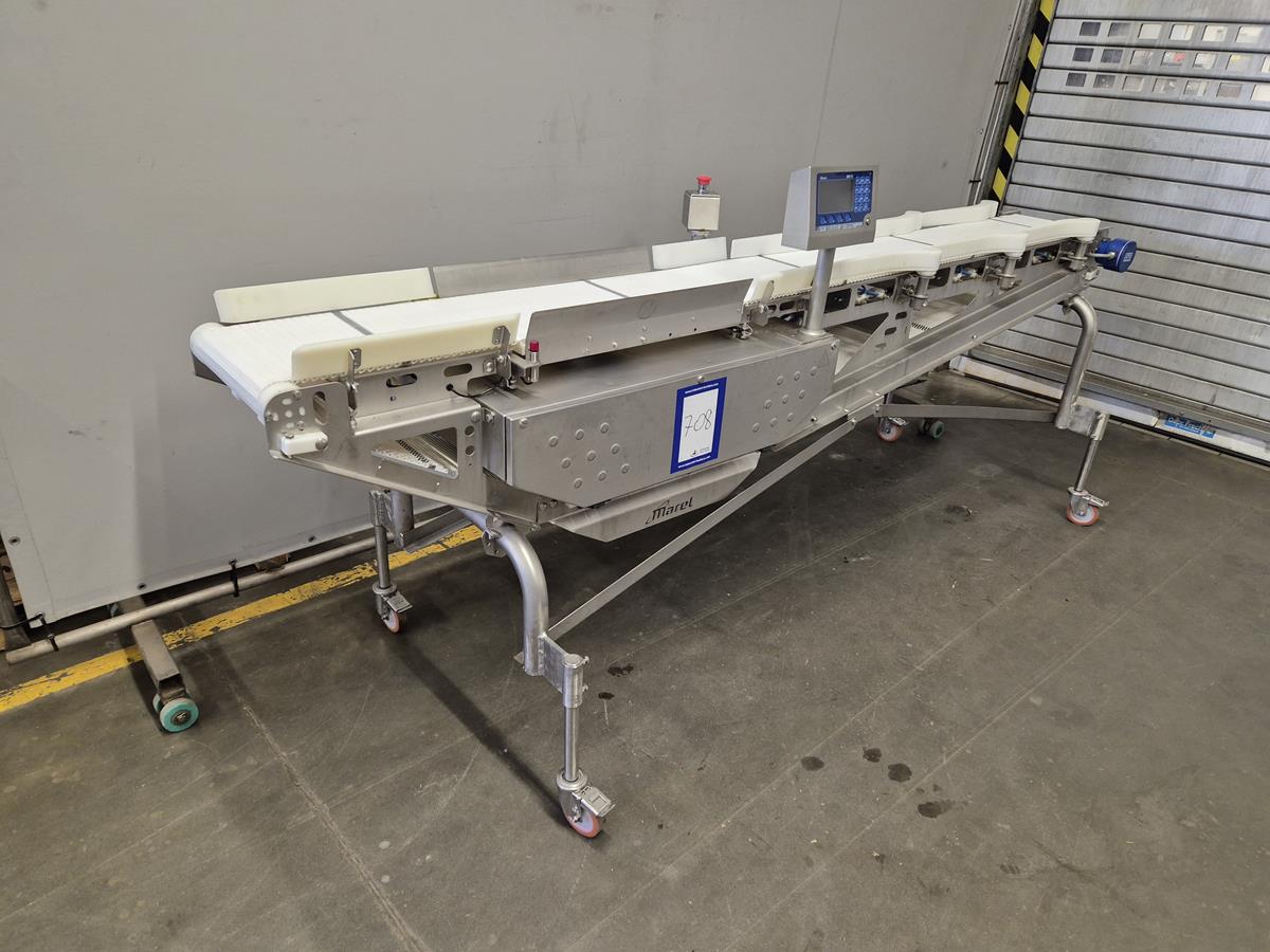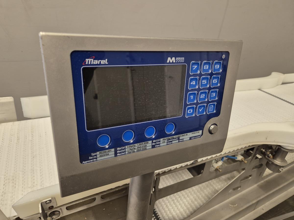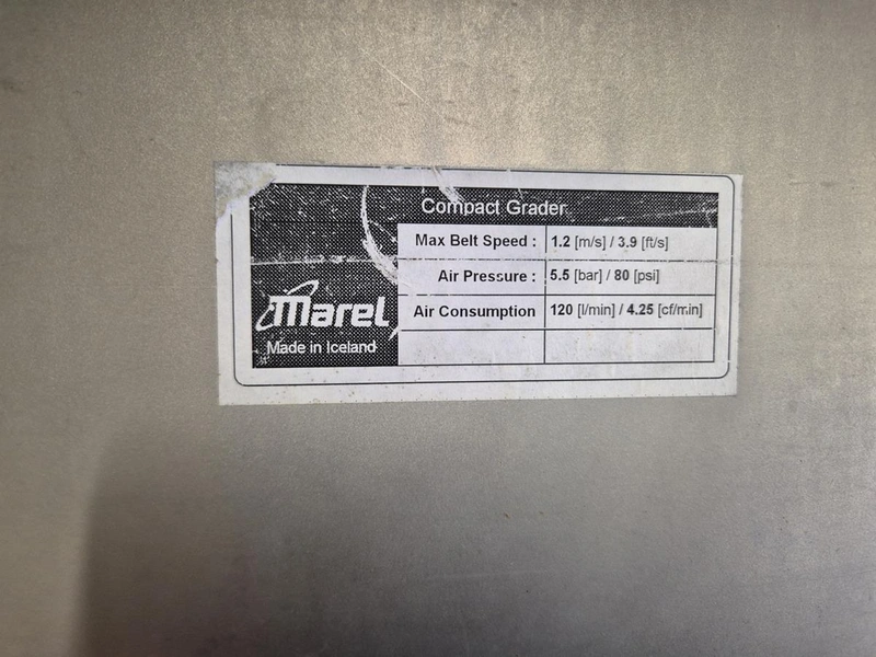 Marel Compact Grader, type: M2200-A01, serial number: A025704, minimum weight: 40/100/200 g, maximum weight: 0.5/1.5/3 kg, plastic belt, total dimensions: 2950 mm x 900 mm x 1300 mm.
