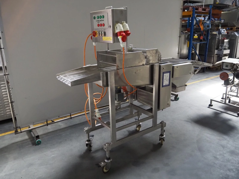 Koppens mobile coating machine, type: ER 400, serial number: 1266, 380 V, 3 Ph, 50 Hz, 2.38 A, 0.62 kW, weight: 165 kg, s/s mesh belt, belt width: 400 mm, total dimensions: 2450 mm x 720 mm x 1810 mm.