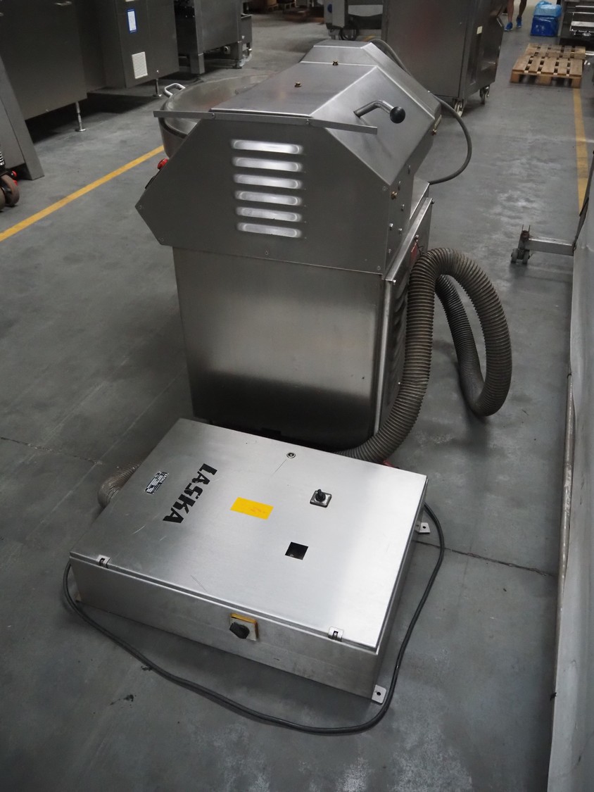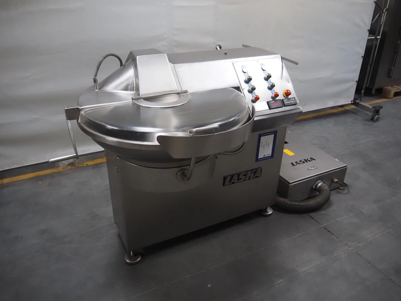 Laska bowl cutter, type: KR 60 2, number: A 5414, 380 V, 3 Ph, 50 Hz, 33.8 A, 16.4 kW, s/s bowl and knives, capacity: 60 liter, total dimensions: 1420 mm x 1050 mm x 1180 mm. Including switch cabinet, dimensions: 600 mm x 800 mm x 210 mm.