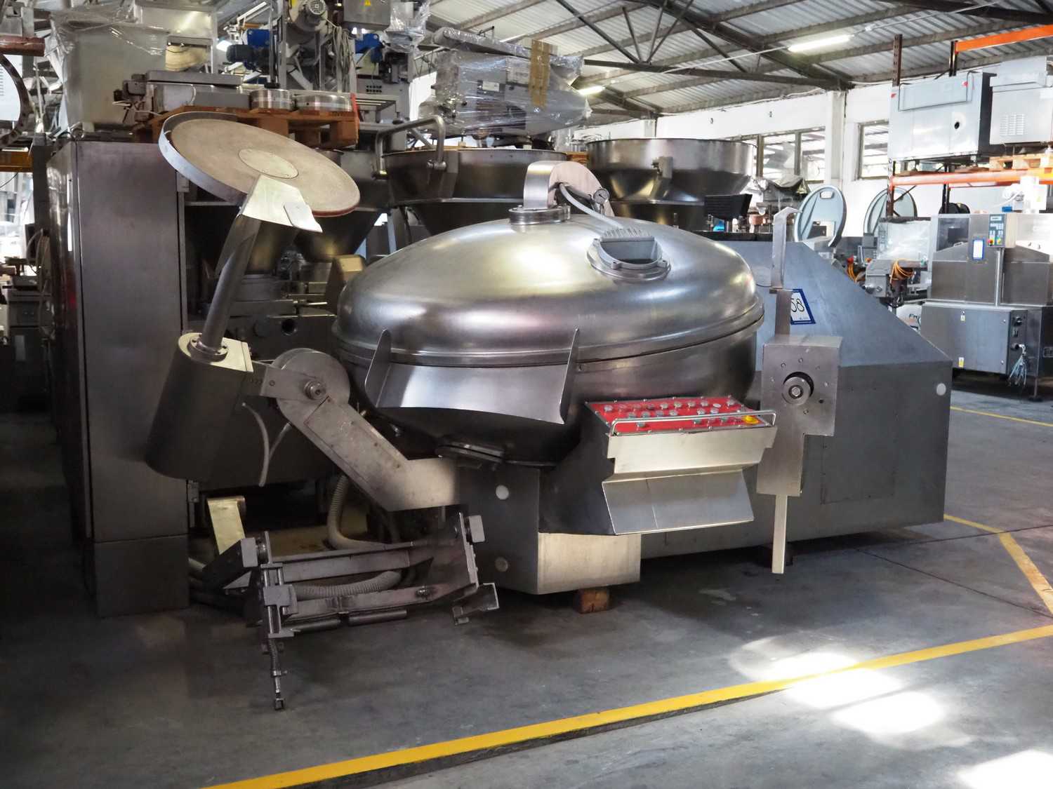 Meissner vacuum bowl cutter with ejector and lifter for 200 liter meat bins, type: VK 325, machine number: 749 019, 380 V, 50 Hz, 235 A, 118 kW, capacity: 325 liter, s/s bowl and knives, dimensions: 3800 mm x 2300 mm x 1850 mm. Without vacuum pump. Overhauled by Servo in 2023.