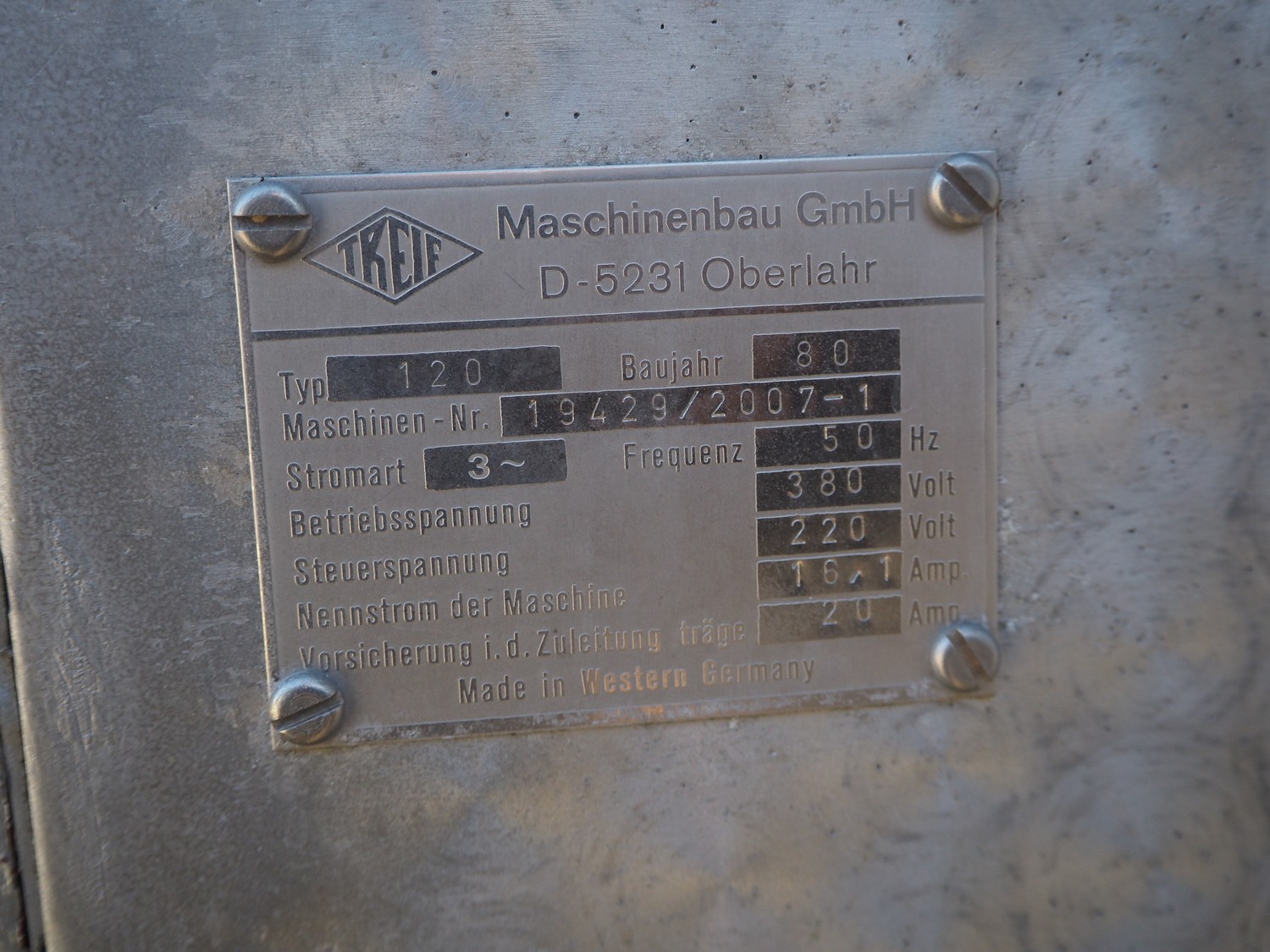 Treif dicer, type: 120, number: 19429/2007-1, year of construction: 1980, 380/220 V, 3 Ph, 50 Hz, 16.1 A, chamber dimensions: 520 mm x 120 mm x 110 mm, distance between knives: 5 mm, total dimensions: 1950 mm x 950 mm x 1550 mm. Extra dicer set with 10 mm blocks.