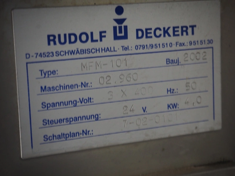 Rudolf Deckert filling machine, type: MFM-101, machine number: 02.960, year of construction: 2002, 400 V, 3 Ph, 50 Hz, 4.0 kW, dimensions: 1700 mm x 1150 mm x 2200 mm.