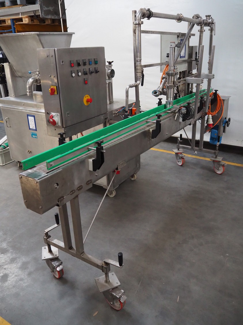 Leonhardt mobile filling station for cans, type: AG 1 DPZ0/S, number: 0140/1022, year of construction: 2002, total dimensions filling machine: 2100 mm x 1300 mm x 1770 mm. With mobile belt, plastic belt, belt width: 100 mm, filling head: Ø 70 mm, total dimensions belt: 3100 mm x 650 mm x 1900 mm.