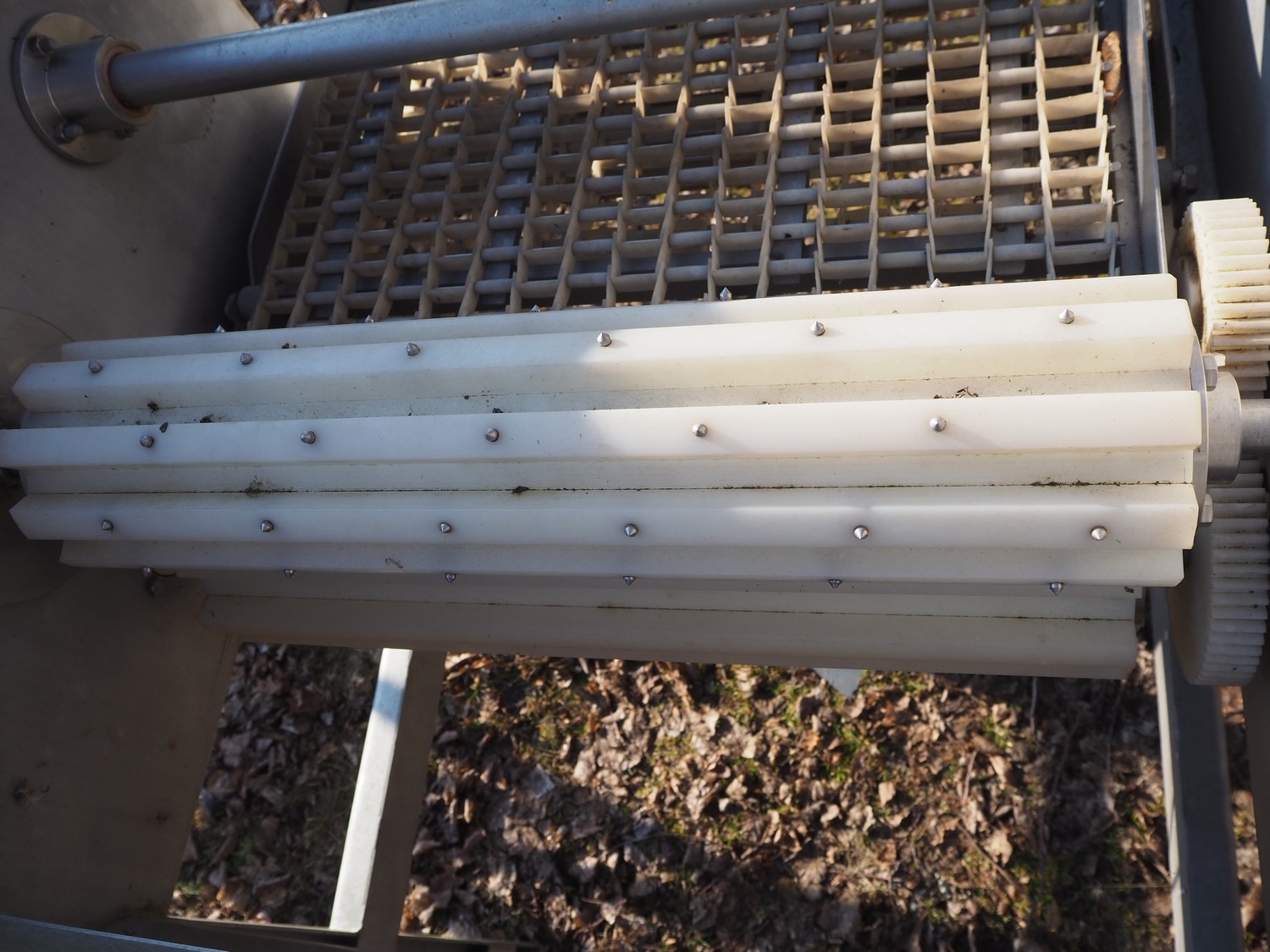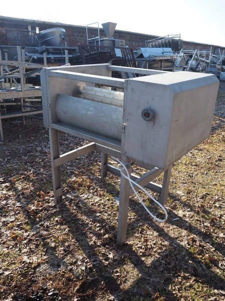 Flattener, machine number: -28, year of construction: 1988, 380 V, 50 Hz, 16 A, plastic mesh belt, working width: 600 mm, total dimensions: 1200 mm x 1160 mm x 1360 mm.