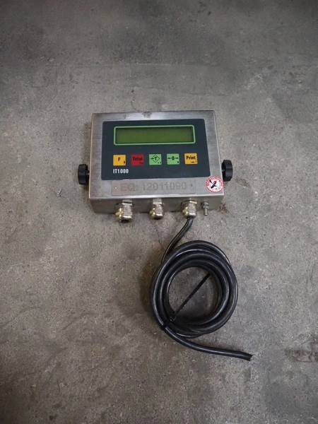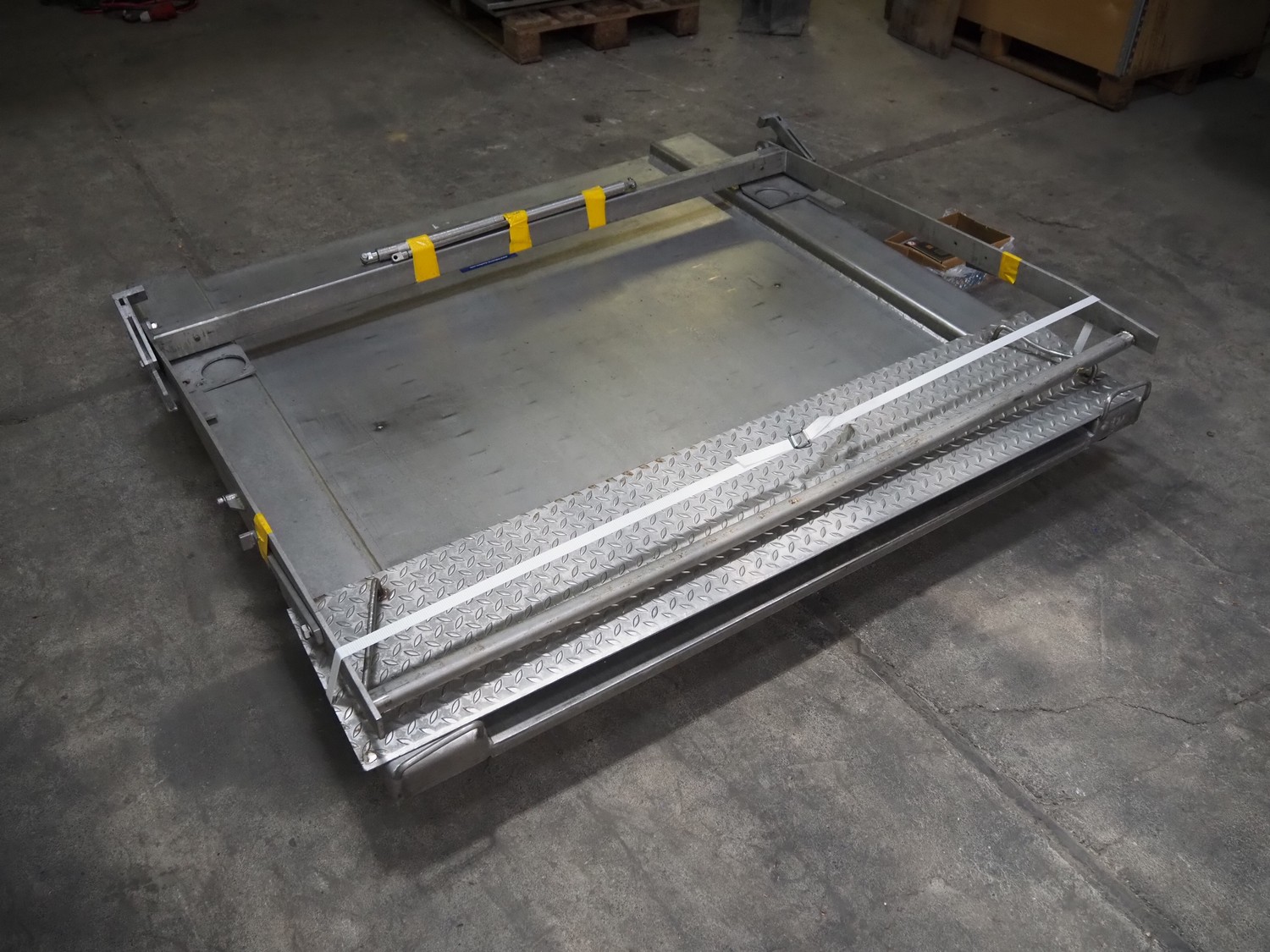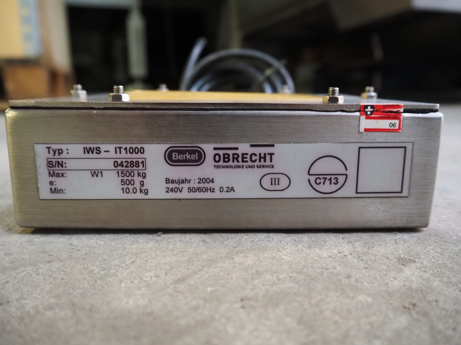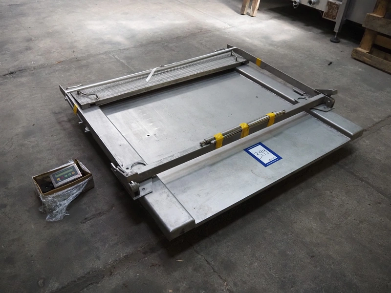 S/s floor weighing scale with Berkel indicator, type indicator: IWS-IT1000, serial number: 042881, year of construction: 2004, 240 V, 50/60 Hz, 0.2 A, max weight: 1500 kg, dimensions weighing scale: 1640 mm x 1500 mm x 340 mm.