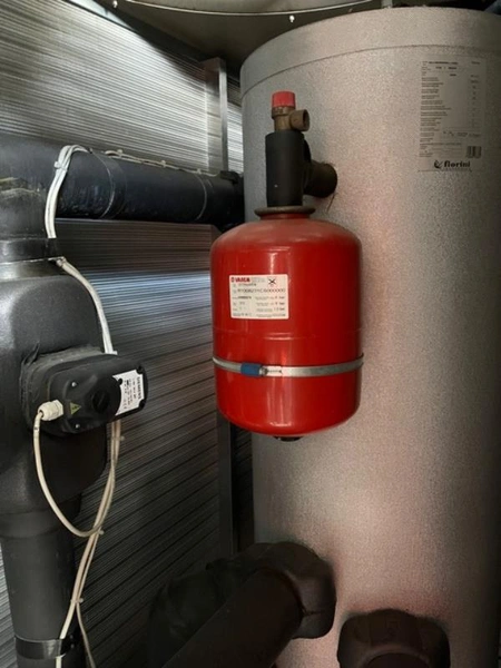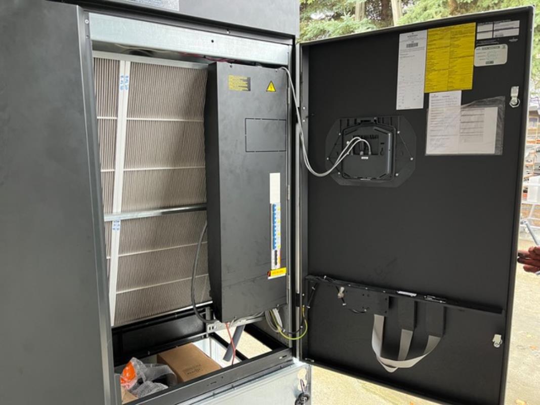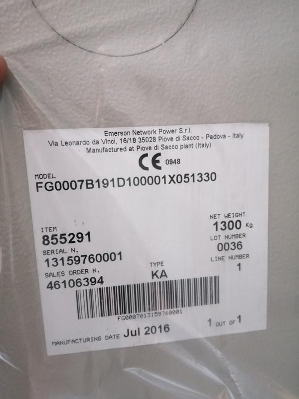 Emerson Network Power S.r.l. heating and chilling unit, type: KA, serial number: 13159760001, year of construction: 2016, net weight: 1300 kg, dimensions chiller: 1200 mm x 3000 mm x 1150 mm. Including 2 air channels, dimensions: 850 mm x 800 mm x 2600 mm and 1350 mm x 900 mm x 2600 mm, 2 Grundfos circulation pumps and pallet with parts.