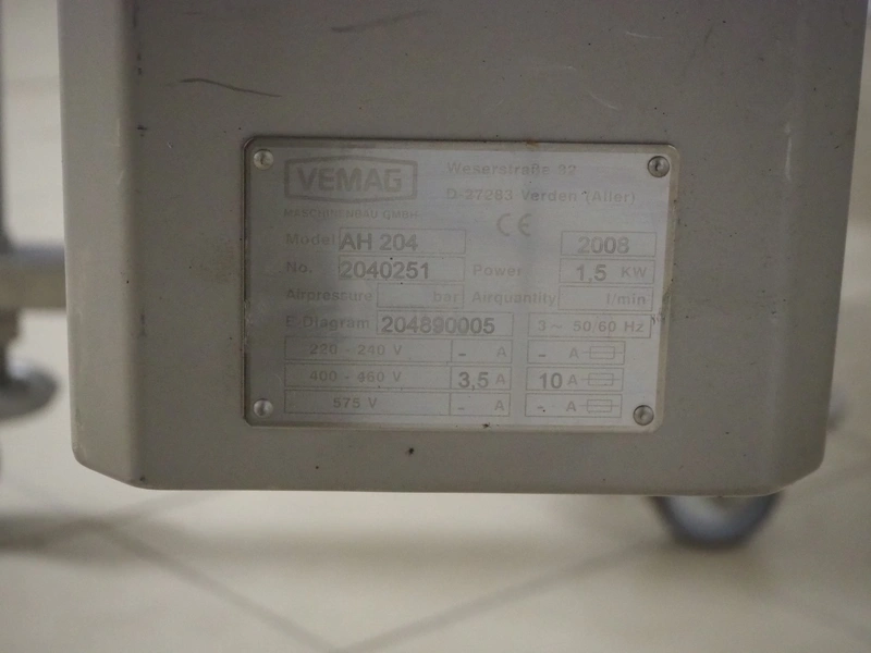 Vemag mobile hanging line, type: AH 204, number: 2040251, year of construction: 2008, 220-575 V, 3 Ph, 50/60 Hz, 3.5/10 A, dimensions: 4000 mm x 750 mm x 1150 mm.