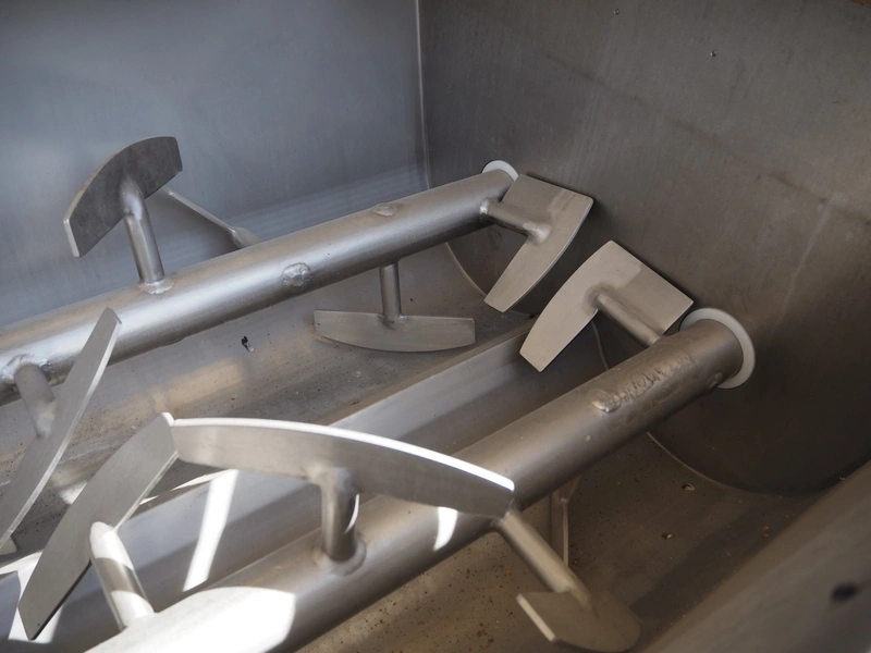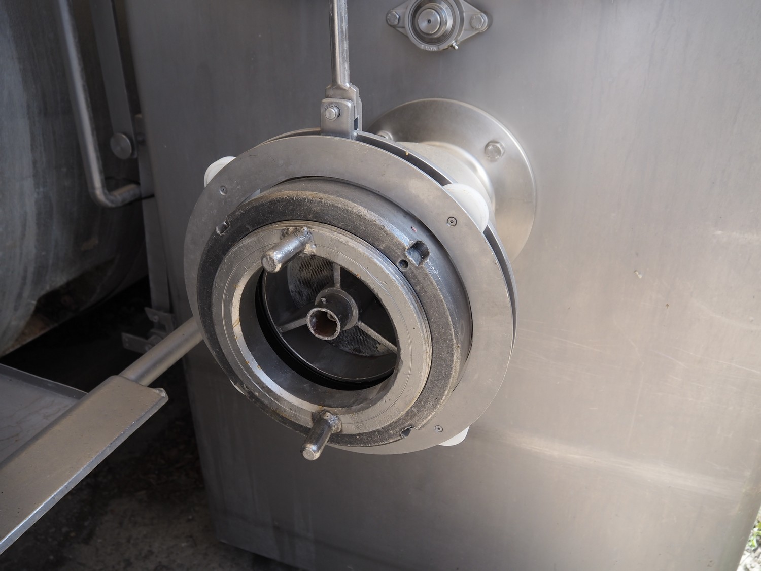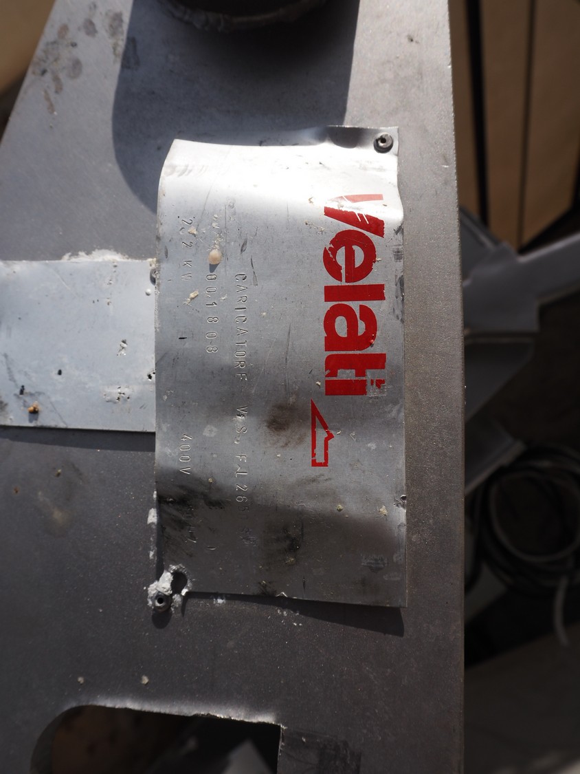 Velati paddle-mixer grinder with lifter for 200 liter meat bins, type: Tritacarne TM 180-180, serial number: 001708, 400 V, 50 Hz, diameter plate: 180 mm, lifting height lifter: 2200 mm, dimensions grinder: 3700 mm x 2000 mm x 2200 mm, dimensions lifter: 1400 mm x 400 mm x 2800 mm.