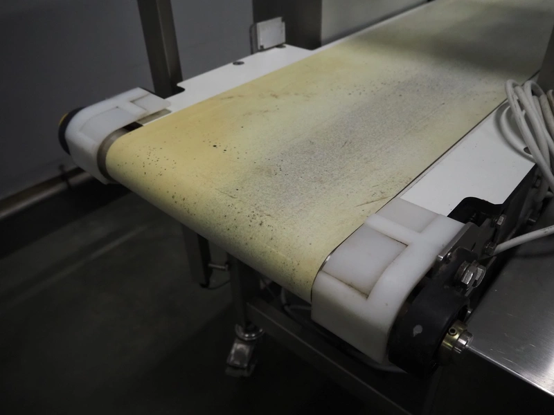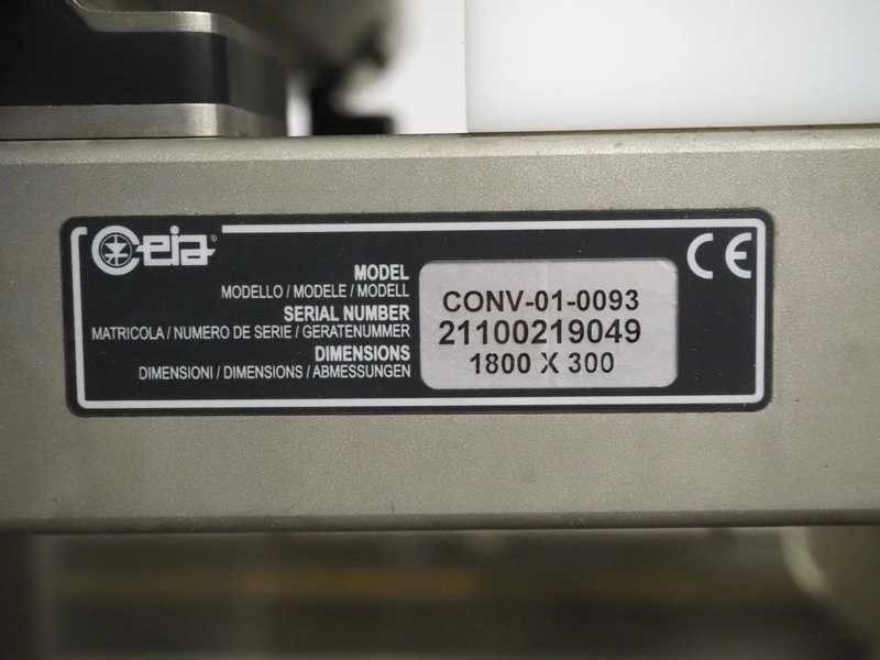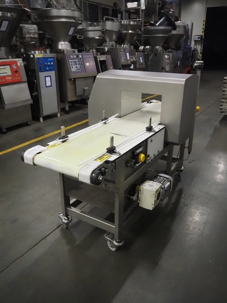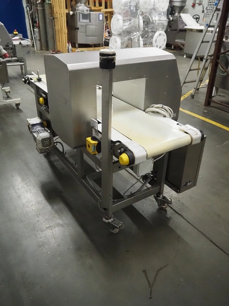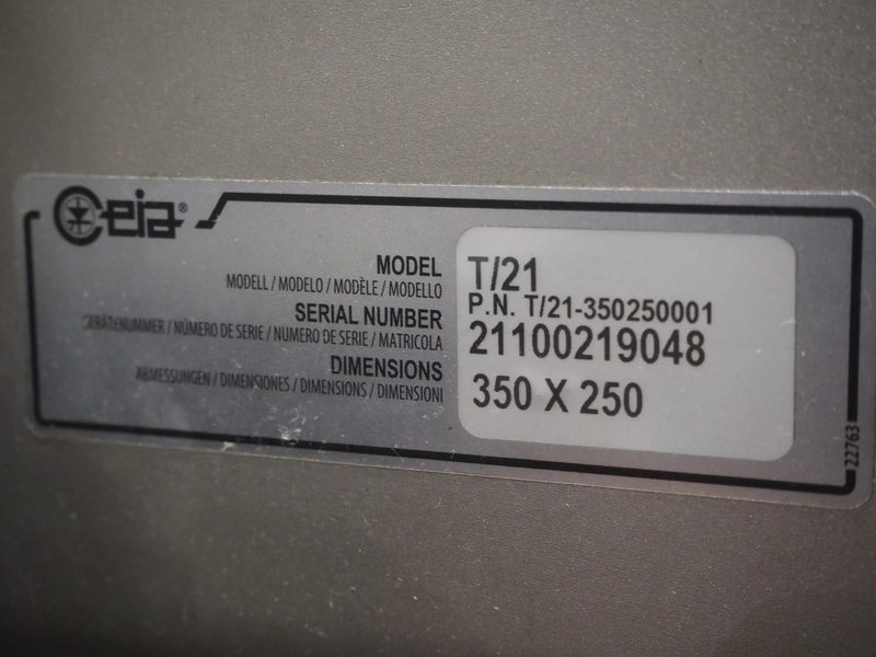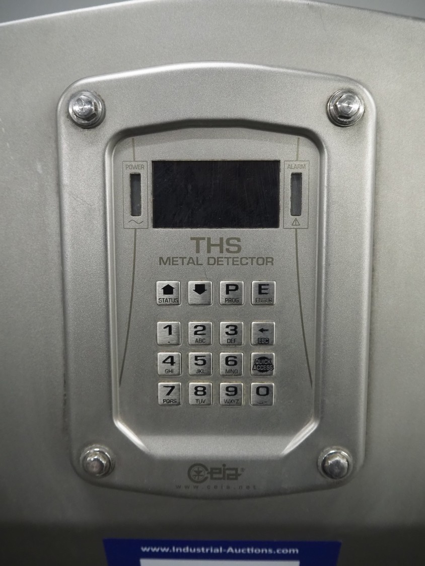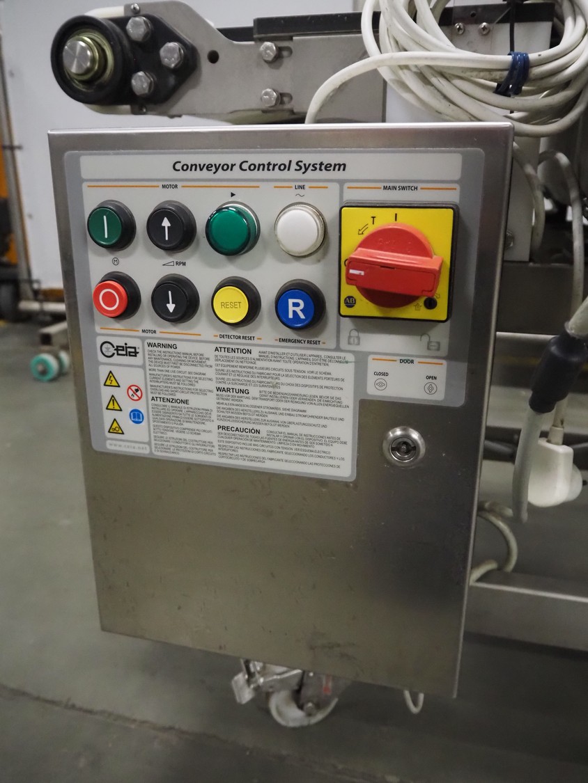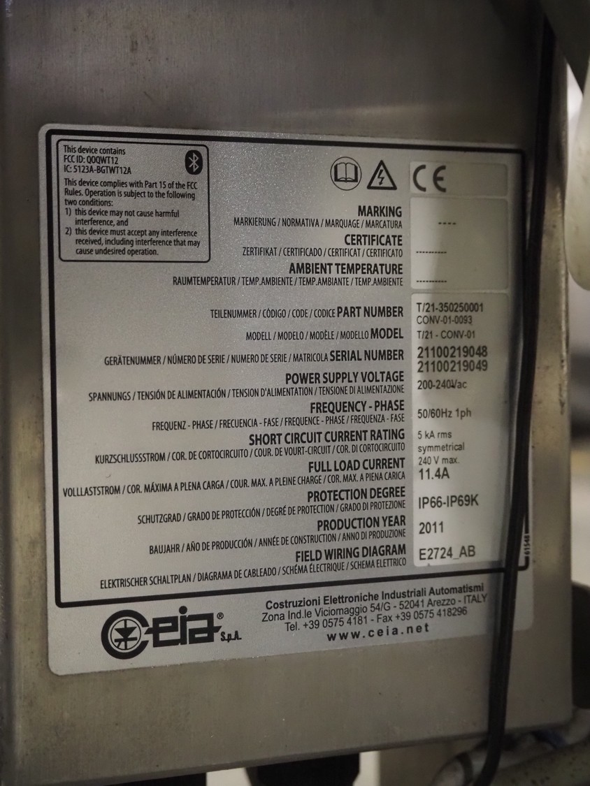 Ceia mobile metal detector, model: T/21, serial number: 21100219048, year of construction: 2011, 200-240 V, 1 Ph, 50/60 Hz, 11.4 A, plastic belt, belt width: 300 mm, clearance: 350 mm x 210 mm, total dimensions: 1820 mm x 850 mm x 1130 mm.