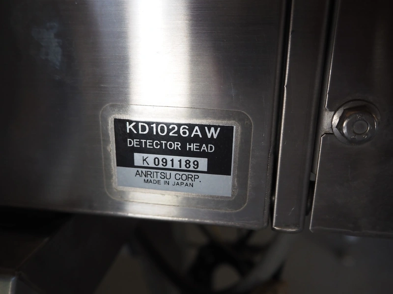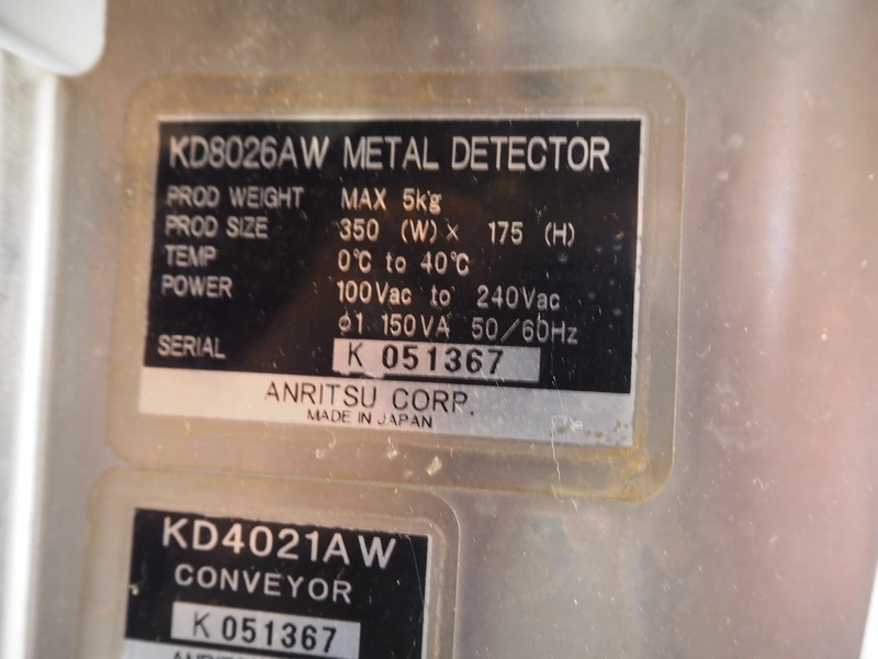Anritsu metal detector, model: IP66, type: KD8026AW, serial number: K051367, year of construction: 2002, 100/240 VAC, 1 Ph, 50 Hz, max weight: 5 kg, plastic belt, belt width: 350 mm, clearance: 450 mm x 175 mm, total dimensions: 800 mm x 830 mm x 1350 mm.