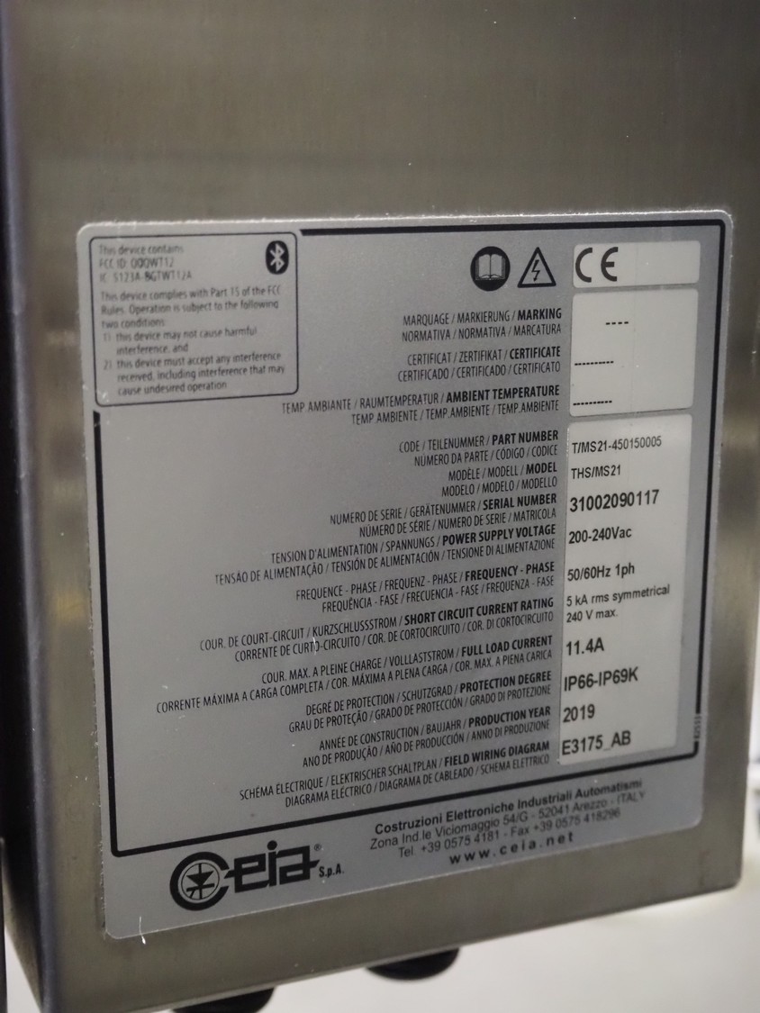 Ceia metal detector, model: THS/MS21, serial number: 31002090117, year of construction: 2019, 200-240 Vac, 1 Ph, 50/60 Hz, 11.4 A, plastic belt, belt width: 355, clearance: 350 mm x 59, total dimensions: 1650 mm x860 mm x 950 mm. Technical condition unknown.