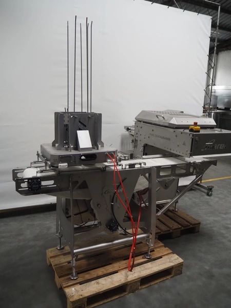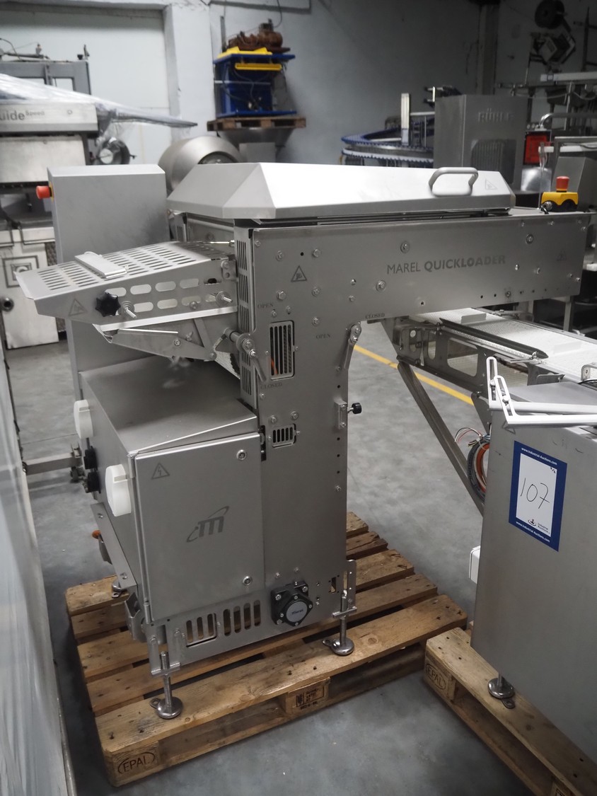 - Marel tray loader, type: Tra-tcon, serial number: A049156, year of construction: 2007, 3x380 V, 3 kW, plastic mesh belt, belt width: 254 mm, total dimensions loader: 1600 mm x 950 mm x 1450 mm.