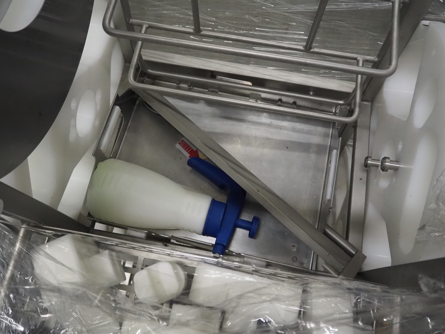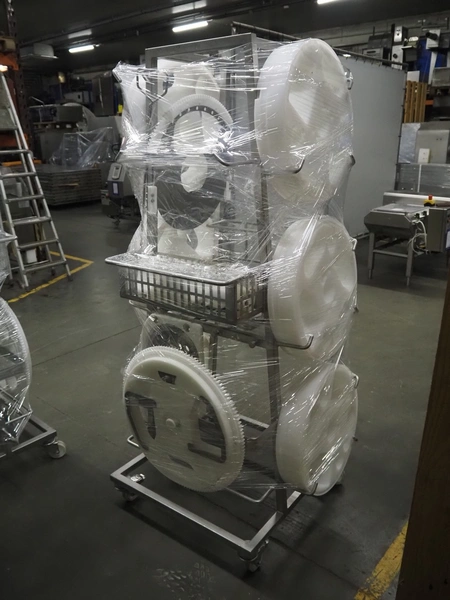 TVI GmbH portioning machine, model: GMS 500, serial number: 0152, year of construction: 2012, 400 V, 3 Ph, 50 Hz, 32 A, plastic mesh belt, belt width: 300 mm, total dimensions: 2000 mm x 1050 mm x 2900 mm, 2 trolleys with various forms, dimensions: (2x) 850 mm x 750 mm x 1800 mm.