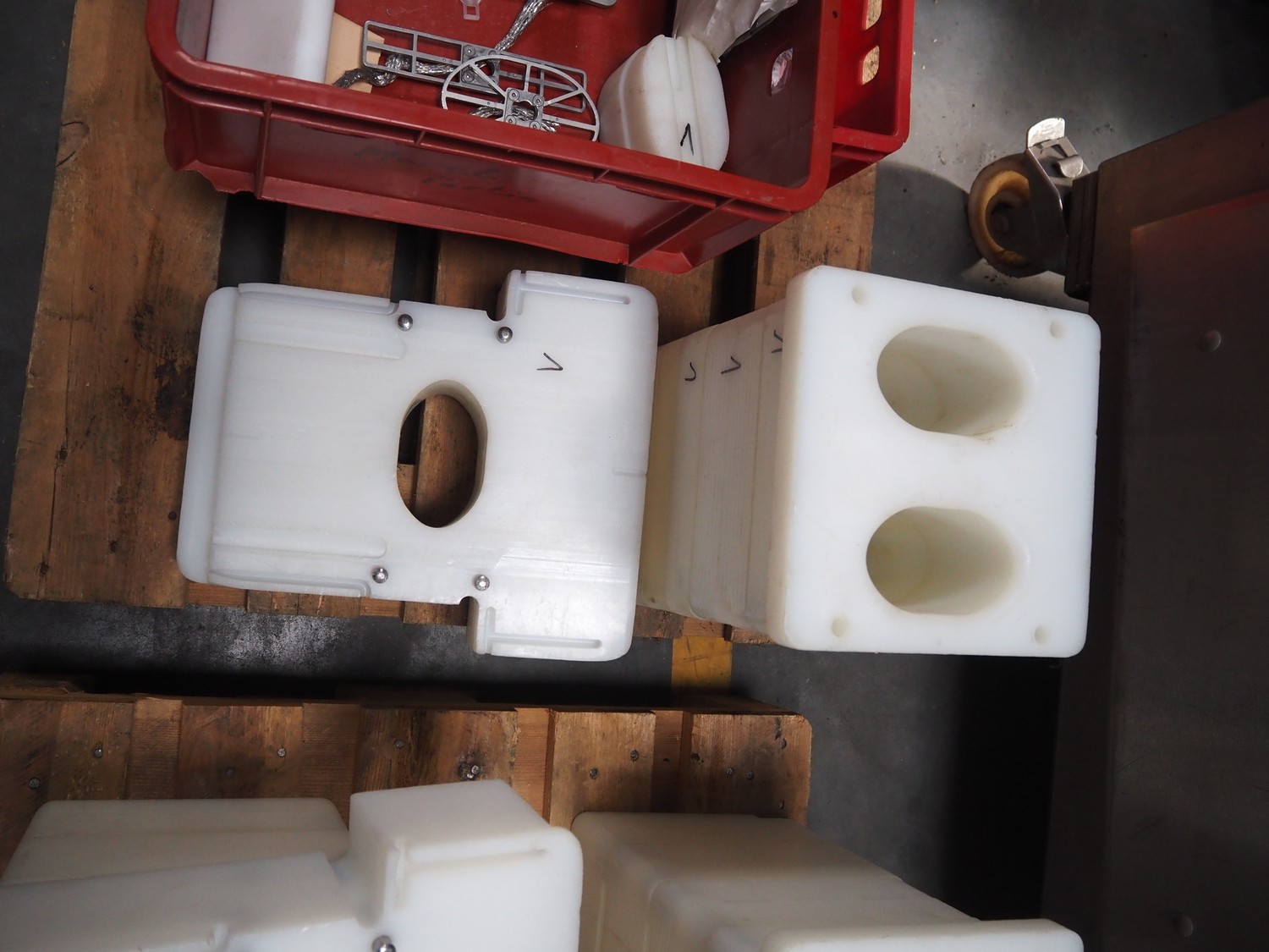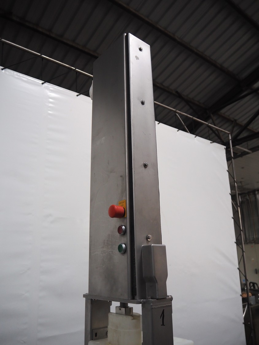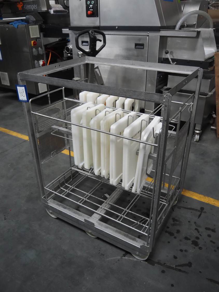 Marel mobile portioning machine, type: Portio 4003 S, serial number: 080S-0079, year of construction: 2006, 400/220 V, 3 Ph, 50/60 Hz, 1.2/2.2 A, 0.5 kW, weight: 500 kg, pressure: 6 / 9 bar, dye: 180 mm x 45 mm, 120 mm x 70 mm, plastic mesh outfeed belt, belt width: 250 mm, total dimensions: 2050 mm x 740 mm x 2600 mm. Including trolley for dyes, dimensions: 870 mm x 620 mm x 1070 mm.