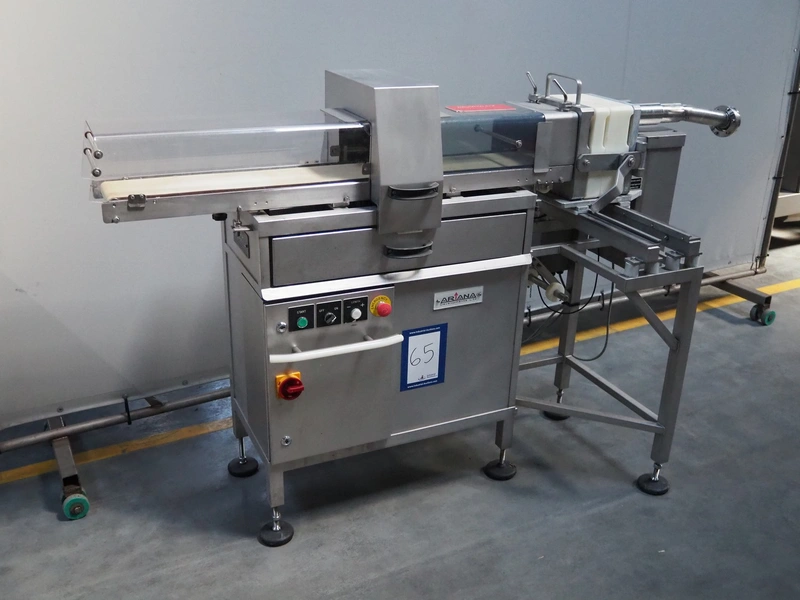 - Ariana portion cutter with interleaver, serial number: 2950-3265, plastic belt, belt width: (2x) 160 mm, total dimensions: 2100 mm x 750 mm x 1260 mm.