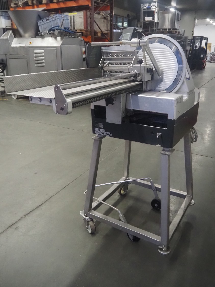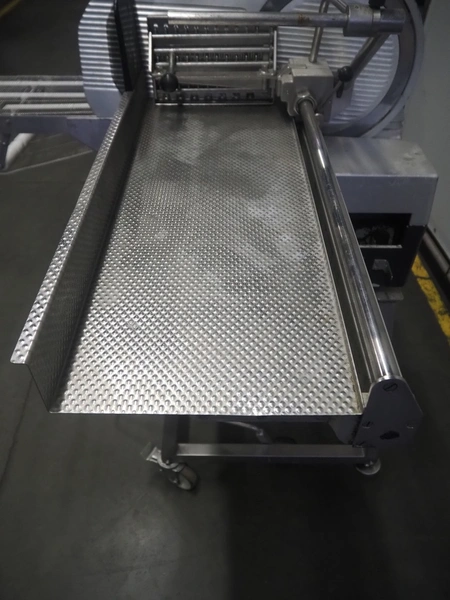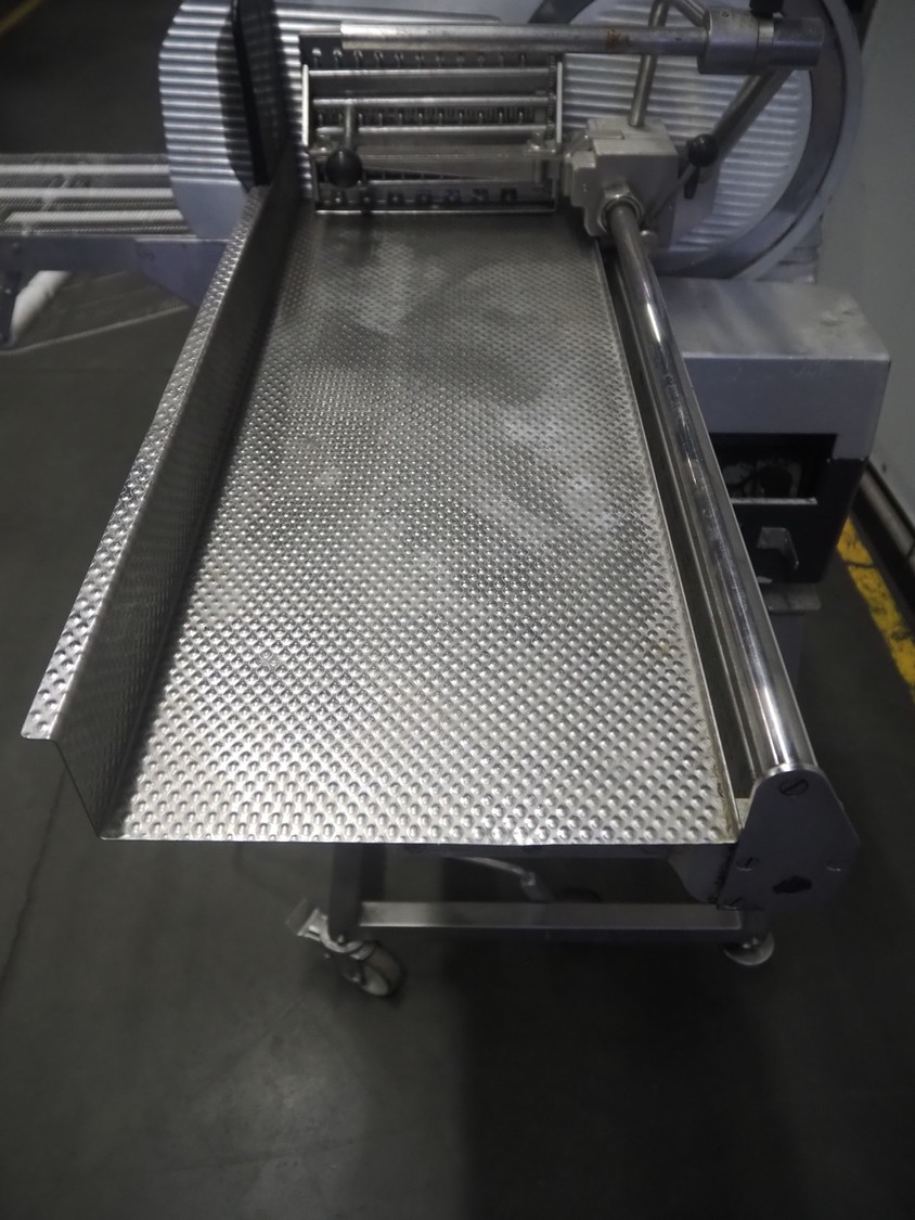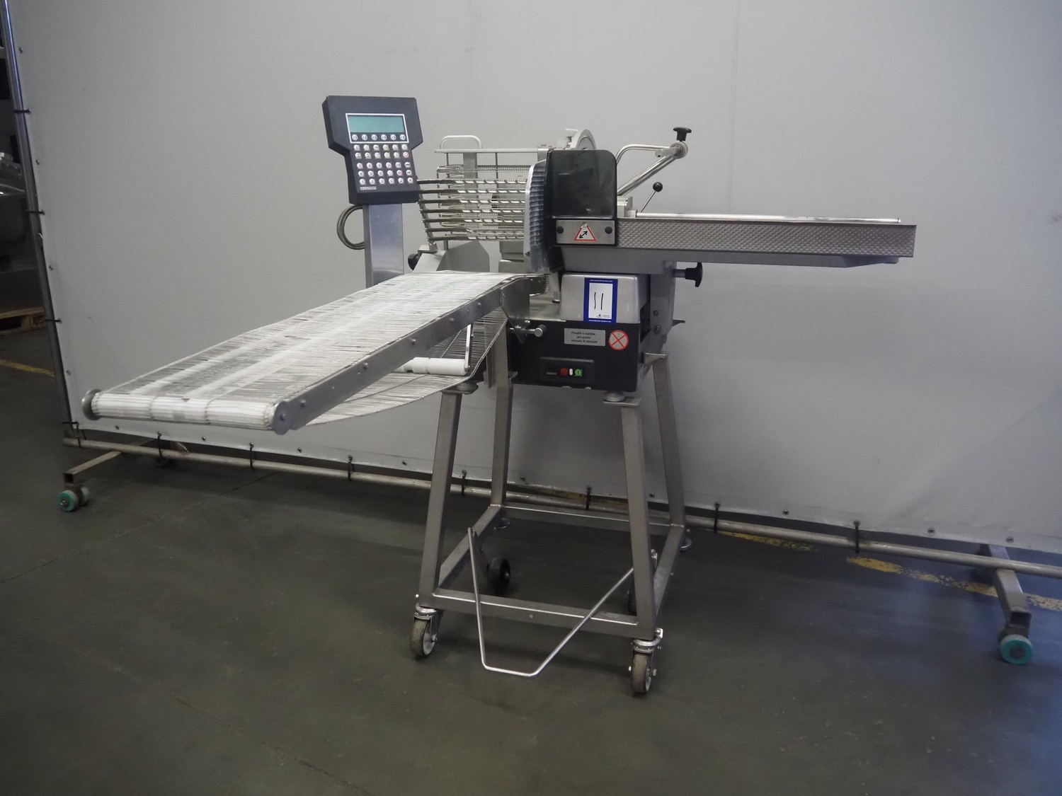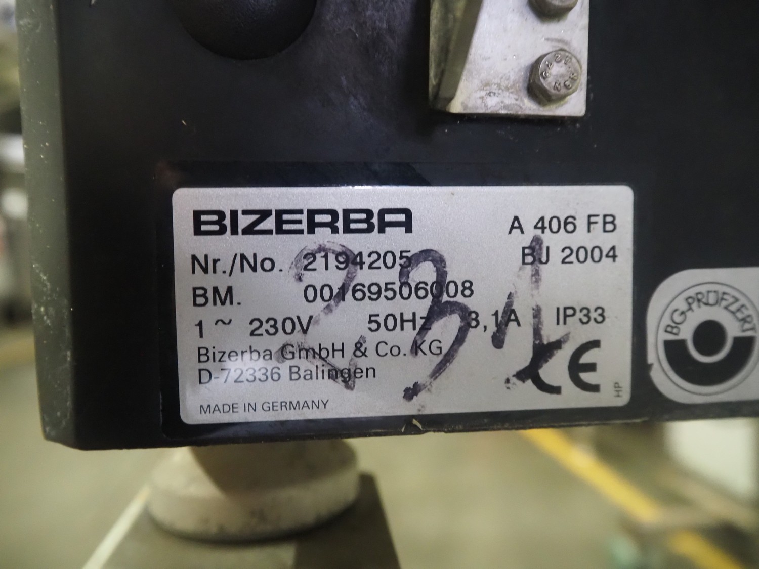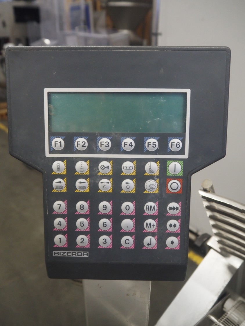 Bizerba mobile automatic slicer, type: A 406 FB, number: 2194205, year of construction: 2004, 230 V, 1 Ph, 50 Hz, 3.1 A, dimensions: 1200 mm x 740 mm x 1380 mm.