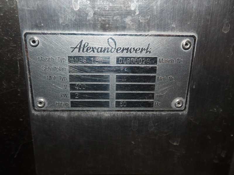 Alexanderwerk mobile belt slicer, type: AWBS 150, machine number: 04800029, 400 V, 50 Hz, 2 kW, belt width: 150 mm, clearance: 150 mm x 150 mm, total dimensions: 2240 mm x 630 mm x 1200 mm. Missing belt.