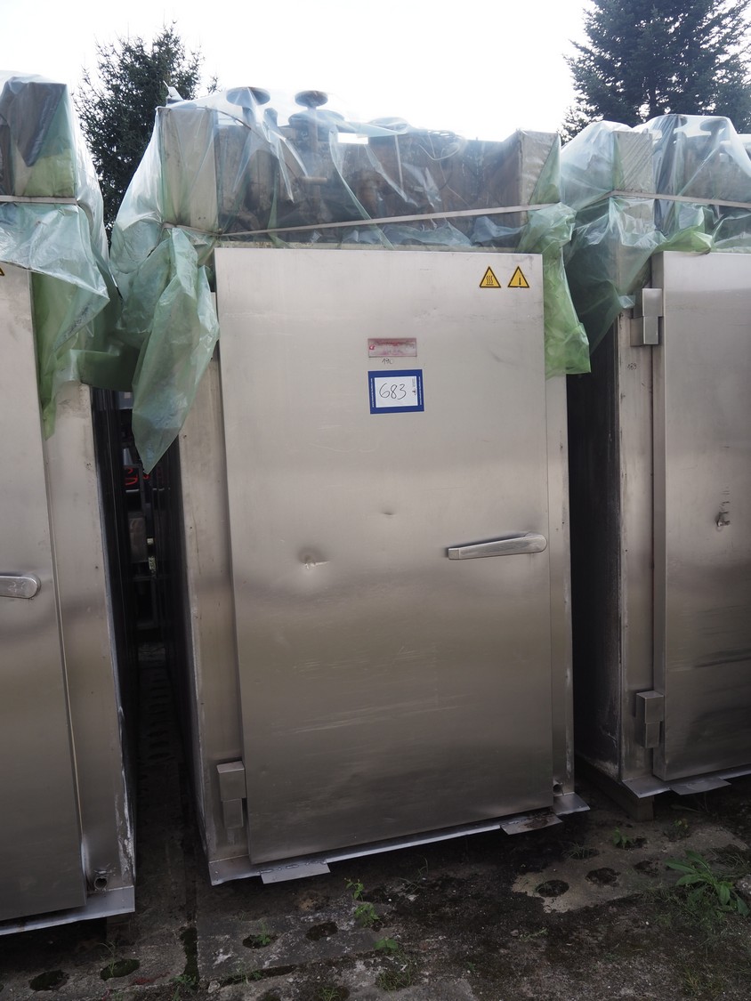 Sorgo smoke chamber for 3 trolleys, inside dimensions: 1300 mm x 3250 mm x 2040 mm, total dimensions: 1450 mm x 3600 mm x 2700 mm. Including smoke generator and switch cabinet, dimensions smoke generator: 880 mm x 1000 mm x 1660 mm.