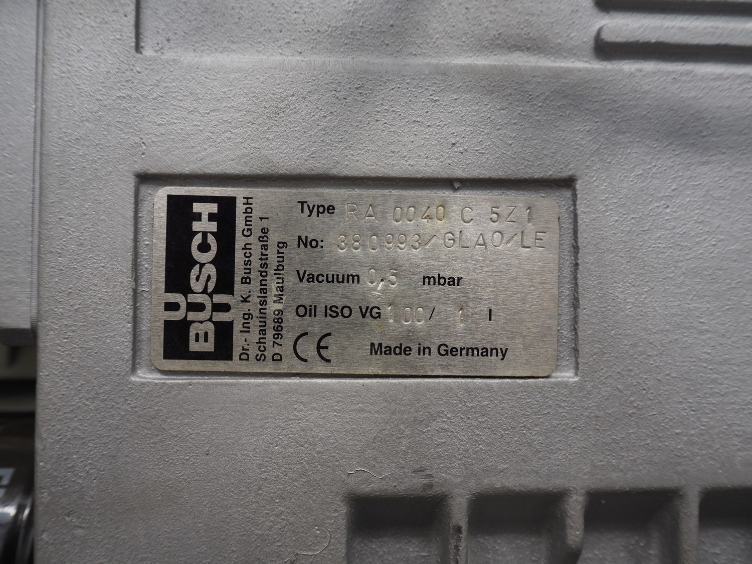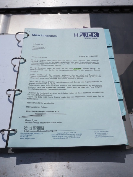 Hajek thermoformer, type: TA20/320, number: 3088, year of construction: 1992, 380 V, 3 Ph, 50 Hz, 8 kW, film width: 320 mm, dye: 280 mm x 170 mm, Busch vacuum pump, type: RA 0040 C, capacity: 40 m³/h, total dimensions: 3400 mm x 900 mm x 2000 mm.