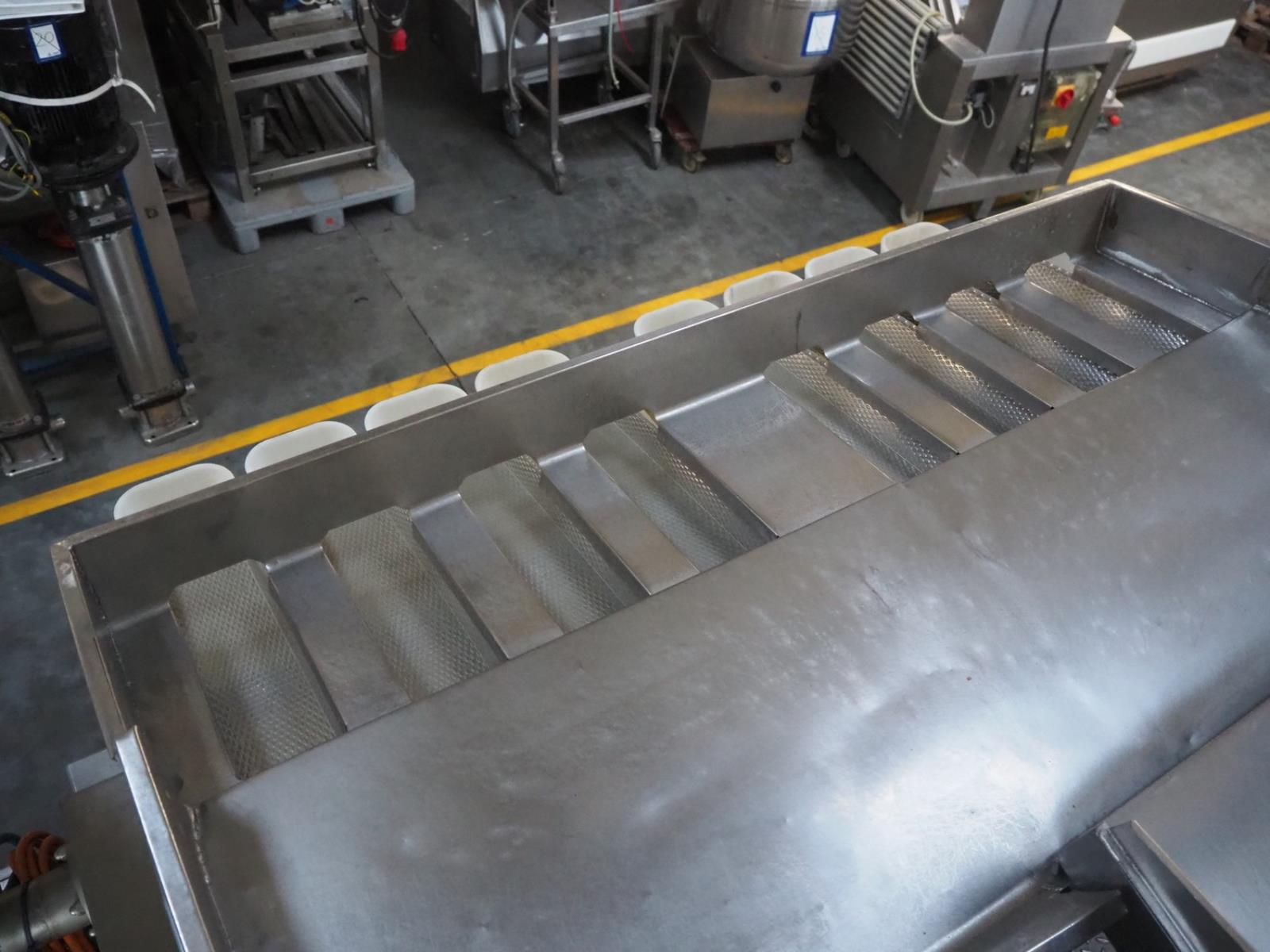 - Infeed belt, s/s frame, chain belt with dividers, distance between dividers: 295 mm, dividers height: 15 mm, belt width: 130 mm, total dimensions infeed belt: 3500 mm x 550 mm x 1210 mm.