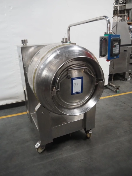 Pökomat mobile vacuum tumbler, inside dimensions: Ø 850 mm x 710 mm, Busch vacuum pump, type: 40-138 422522, capacity: 40m³/hour, total dimensions: 880 mm x 1380 mm x 1760 mm.