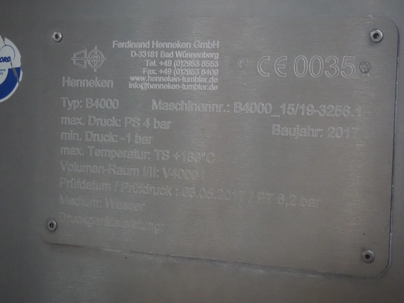 Henneken vacuum tumbler, type: B4000, machine number: B4000_15/19-3256.1, year of construction: 2017, volume: 4000 liter, dimensions: 4200 mm x 1700 mm x 2150 mm. Without vacuum pump.