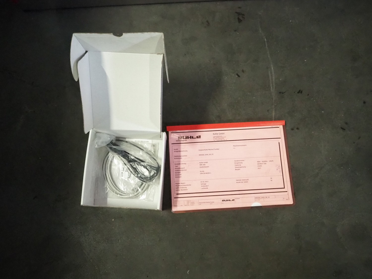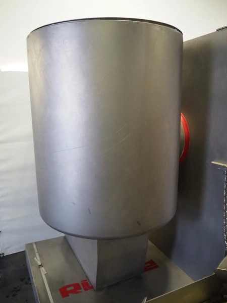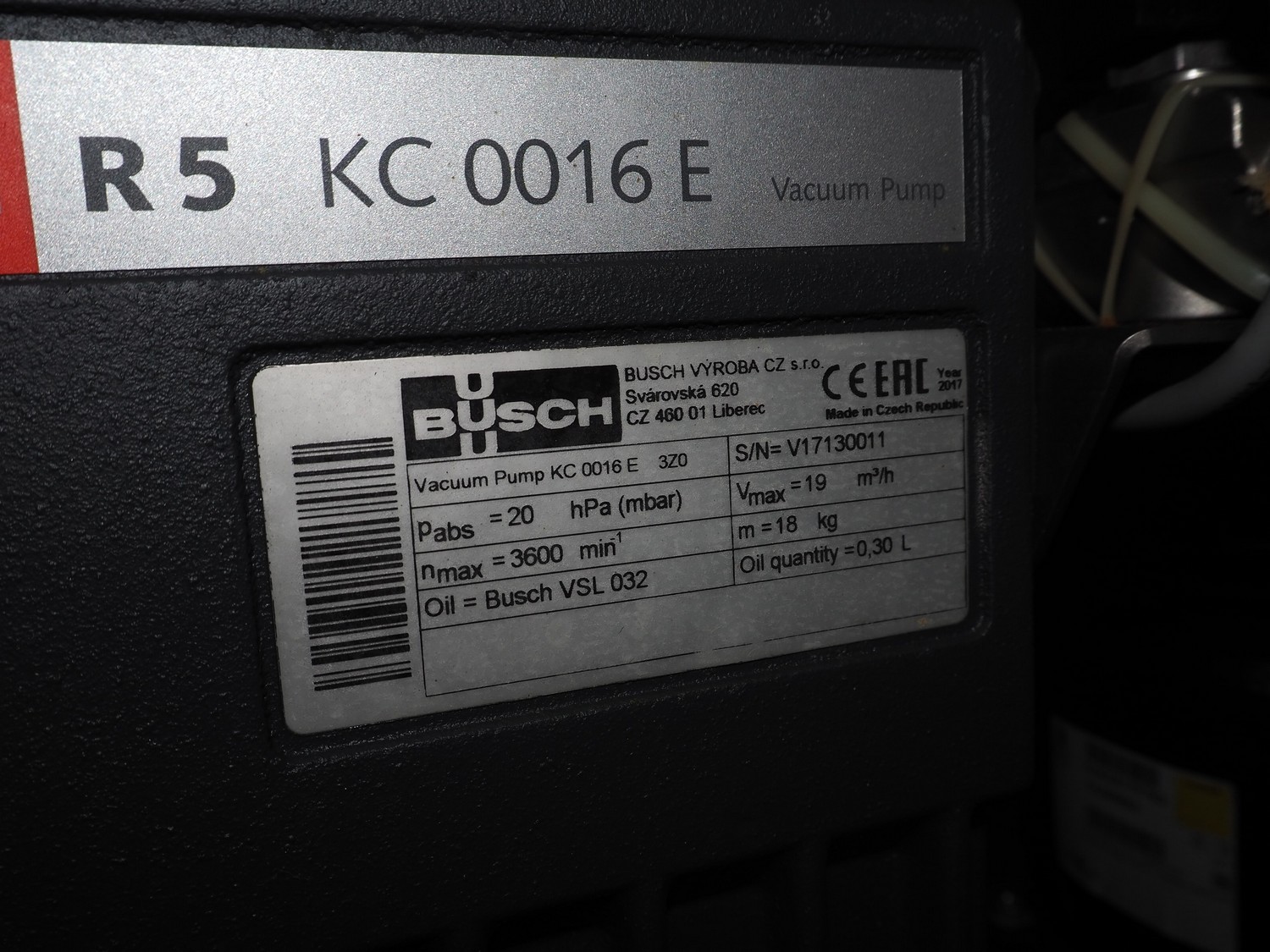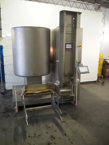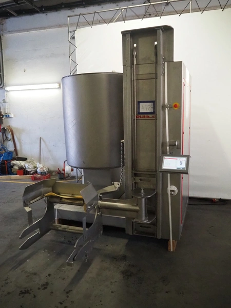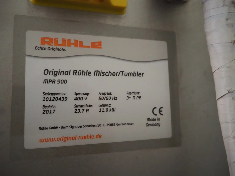 Rühle cooled vacuum tumbler with lifter for 200 liter meat bins, type: MPR 900, serial number: 10120439, year of construction: 2017, 400 V, 3 Ph, 50/60 Hz, 23.7 A, 11.9 kW, Busch vacuum pump, type: KC 0016 E 3Z0, capacity: 19 m³ per hour, dimensions: 1850 mm x 2300 mm x 2350 mm. Including pallet with parts.