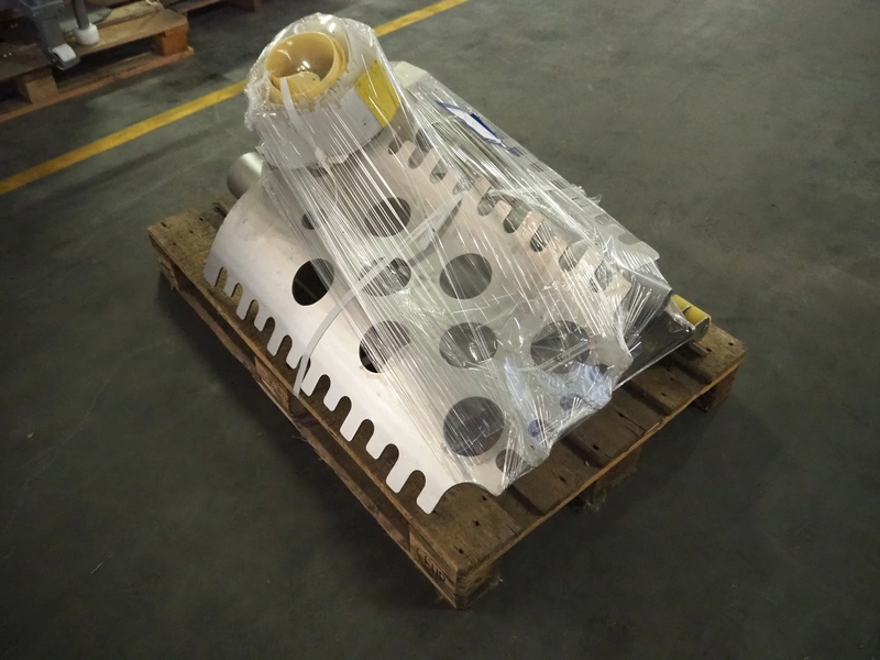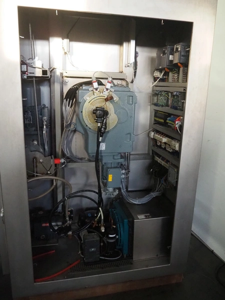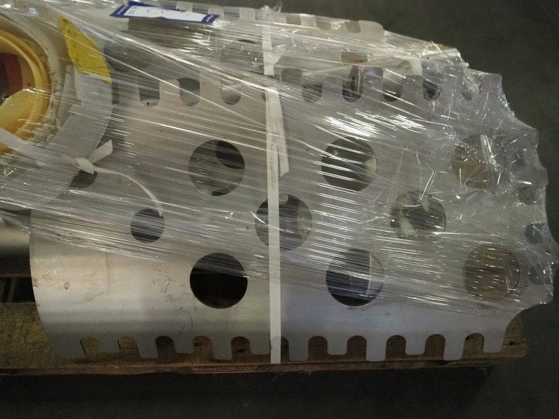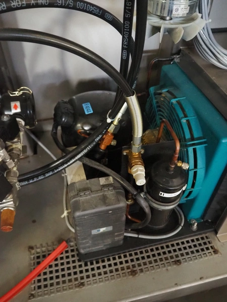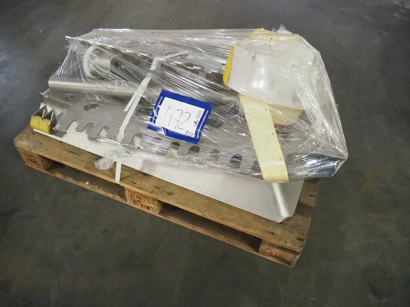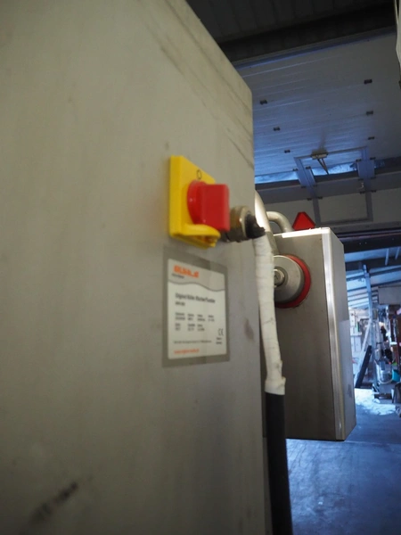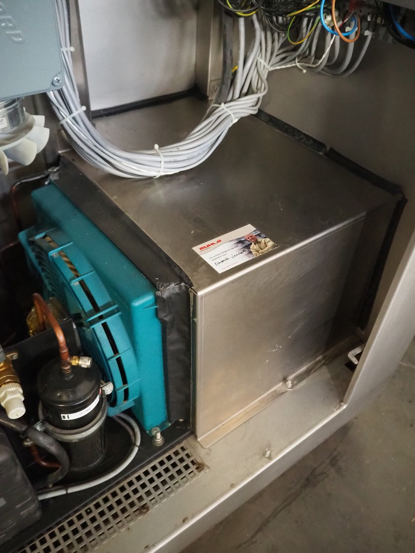 Rühle cooled vacuum tumbler with lifter for 200 liter meat bins, type: MPR 900, serial number: 10120439, year of construction: 2017, 400 V, 3 Ph, 50/60 Hz, 23.7 A, 11.9 kW, Busch vacuum pump, type: KC 0016 E 3Z0, capacity: 19 m³ per hour, dimensions: 1850 mm x 2300 mm x 2350 mm. Including pallet with parts.