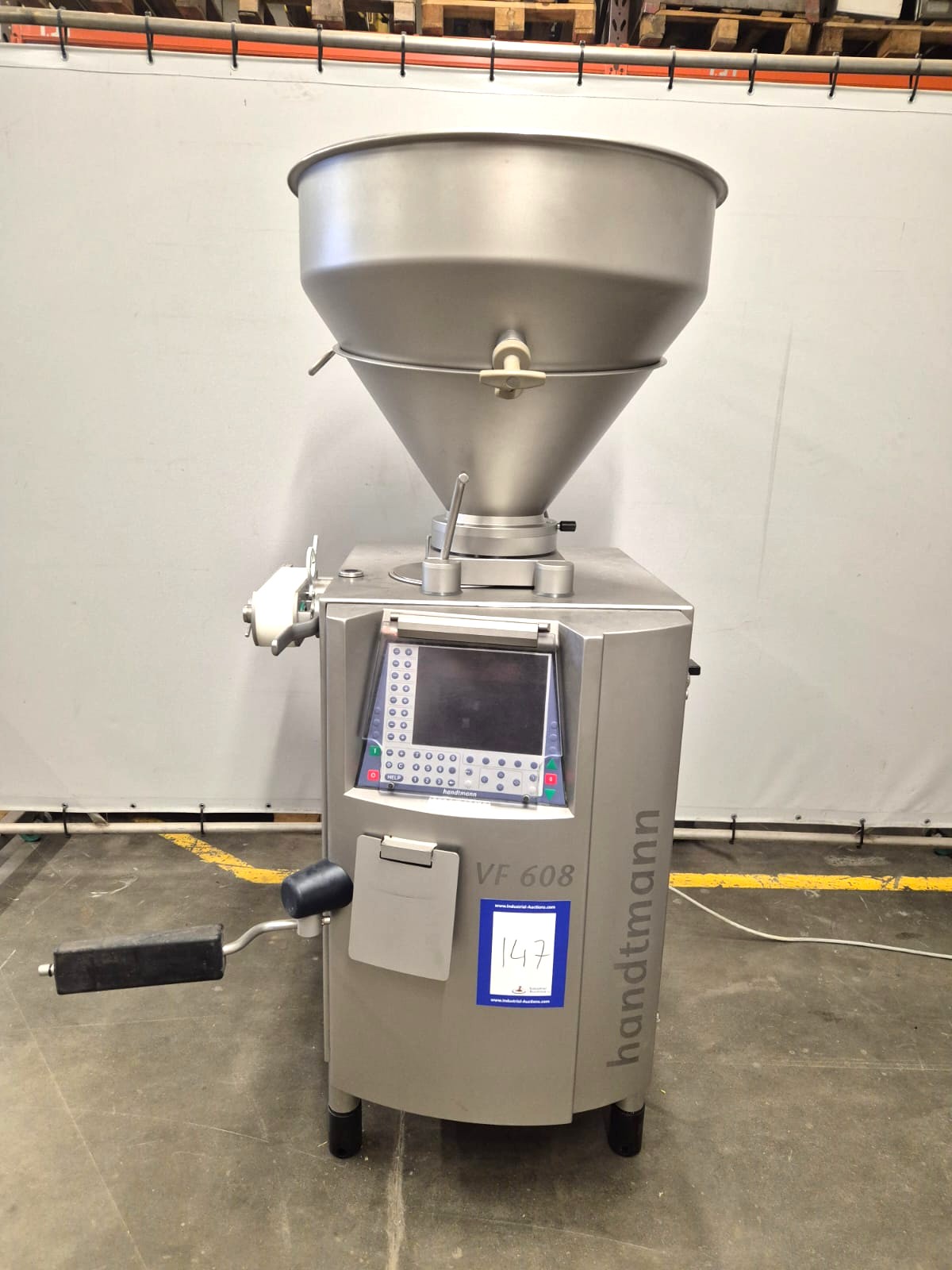 Handtmann vacuum filling machine with linking attachment, type: VF608, number: 25047 S, year of construction: 2008, 400 V, 3 Ph, 50 Hz, 3 kW, 5.1 A, Busch vacuum pump, type: KC 0016 D, 16m3/h, linking attachment number: 34-5/28592, total dimensions: 700 mm x 800 mm x 1850 mm.