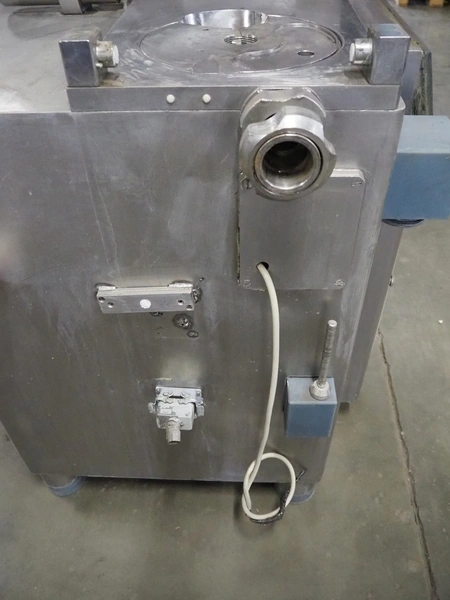 Risco vacuum filling machine with lifter for 200 liter meat bins, type: RS 5001, serial number: C194005, year of construction: 1995, 380 V, 3 Ph, 50 Hz, 35 A, 12 kW, dimensions: 2200 mm x 1100 mm x 2300 mm. With case spooling device among others.