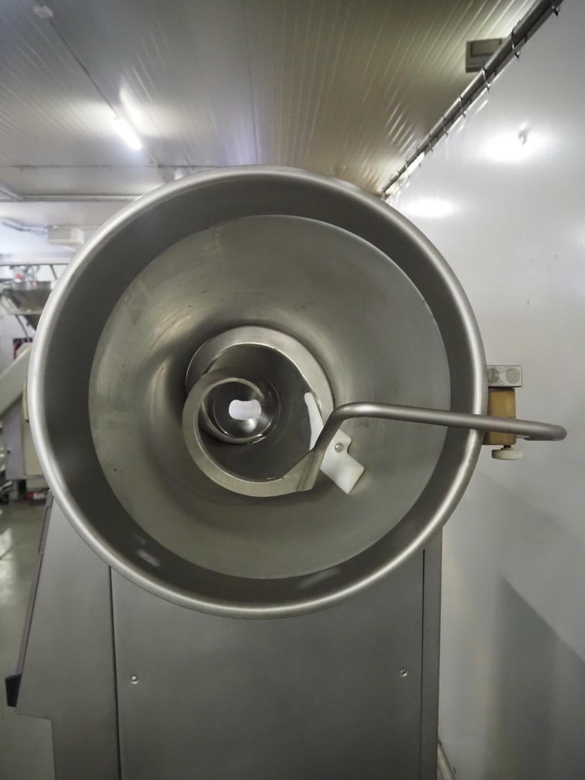 Handtmann vacuum filling machine with linking attachment, type: VF50, number: 3316, 380 V, 50 Hz, 11 A, 4 kW, dimensions: 830 mm x 690 mm x 1800 mm.