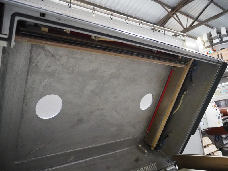 Cryovac belt vacuum machine, model number: VC 14 RH, serial number: A50011625, year of construction: 1999, 400 V, 50 Hz, 40 A, 13 kW, plastic belt, belt width: 475 mm, plastic rollers, roller width: 540 mm, seal length: 940 mm and 650 mm, total dimensions: 1620 mm x 1050 mm x 1180 mm.