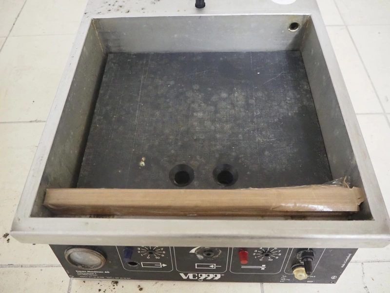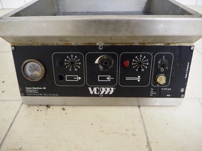 Inauen Maschinen AG vacuum machine, type: VC 999/06E, number: 06E871340, 220 V, 50 Hz, 10 A, 19 kW, seal width: 350 mm, dimensions chamber: 350 mm x 360 mm, total dimensions: 650 mm x 400 mm x 250 mm. Cover broken.