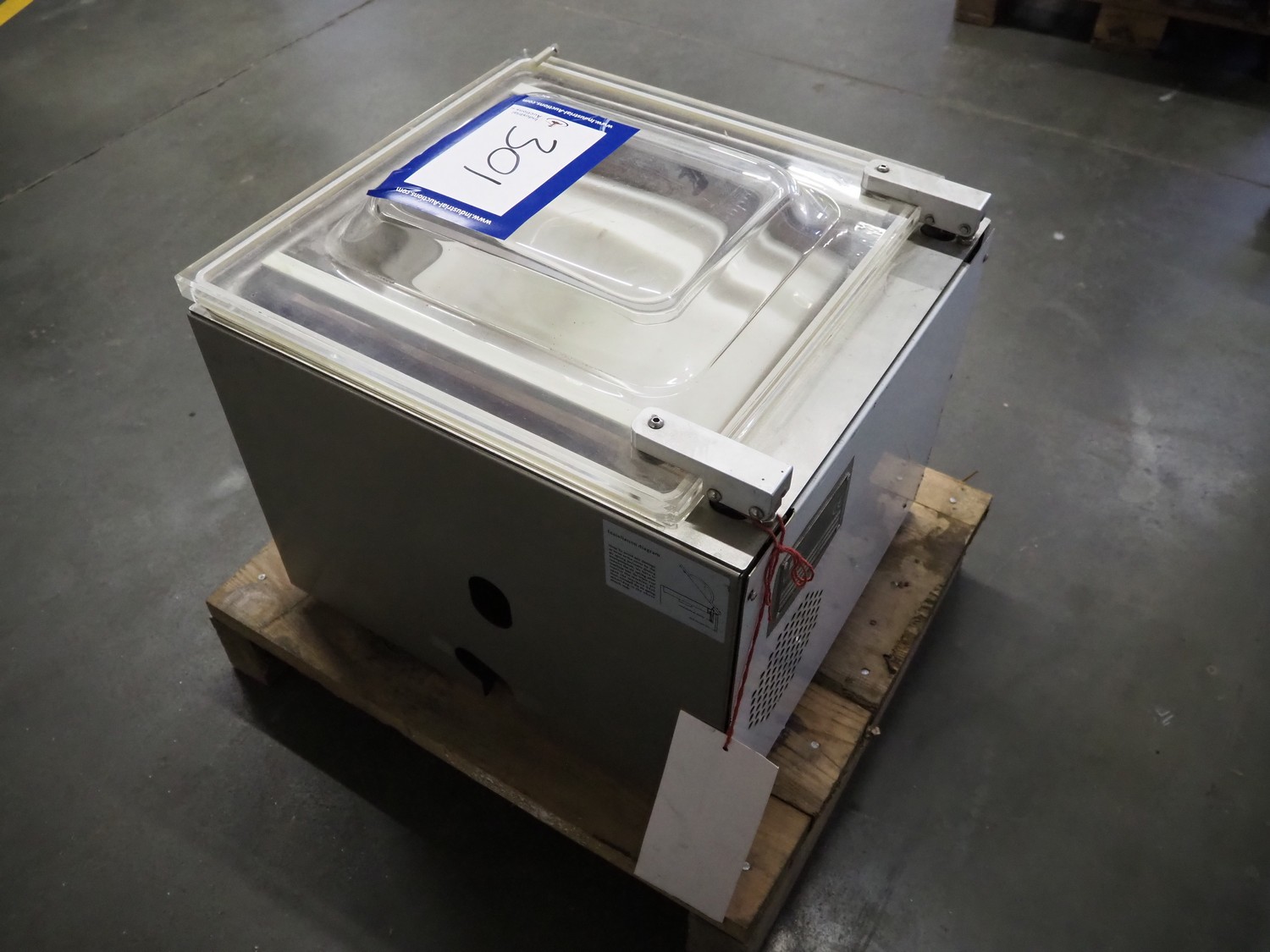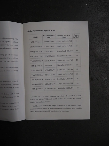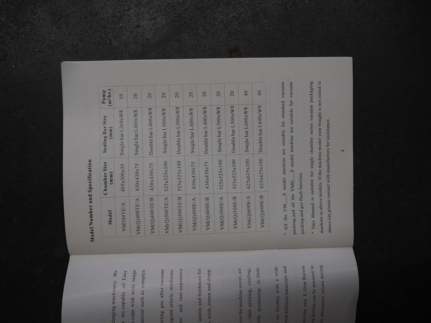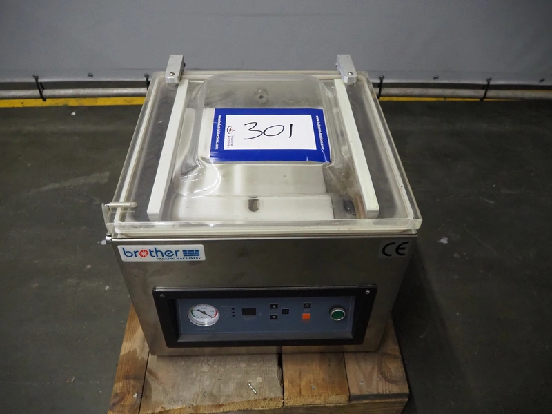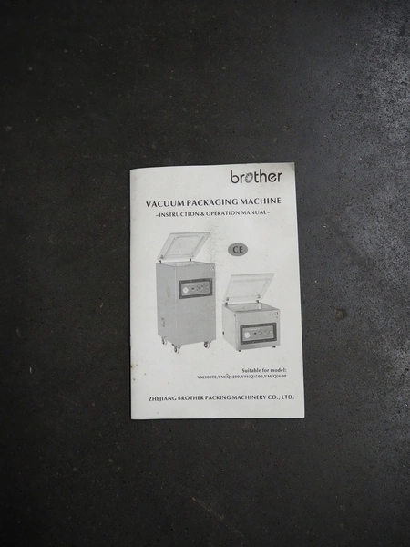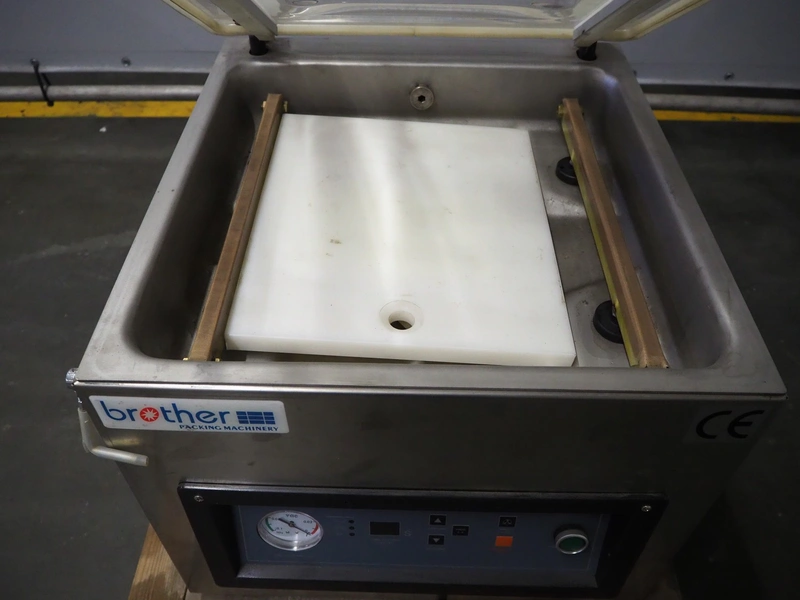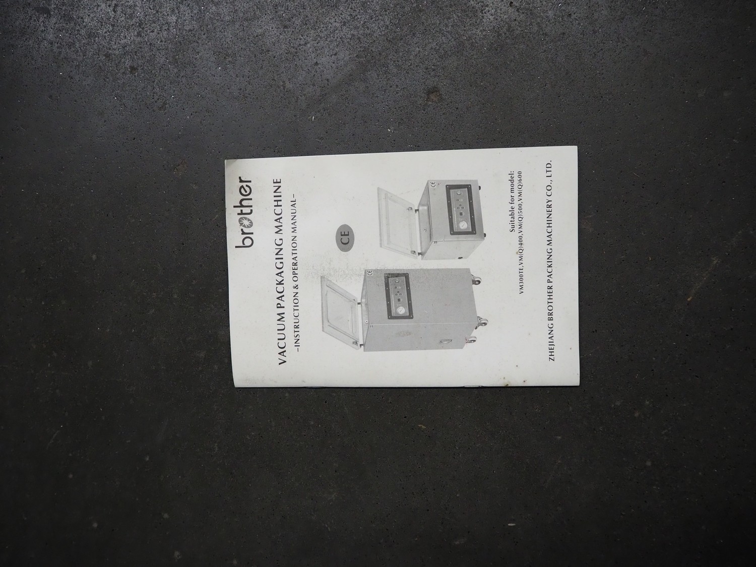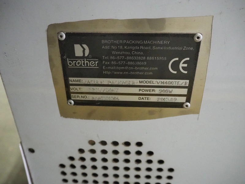 Brother Packing Machinery vacuum machine, model: VM400TE/B, serial number: bpm15F799, seal length: (2x) 400 mm, chamber dimensions: 400 mm x 325 mm, total dimensions: 500 mm x 520 mm x 450 mm. Missing vacuum pump.