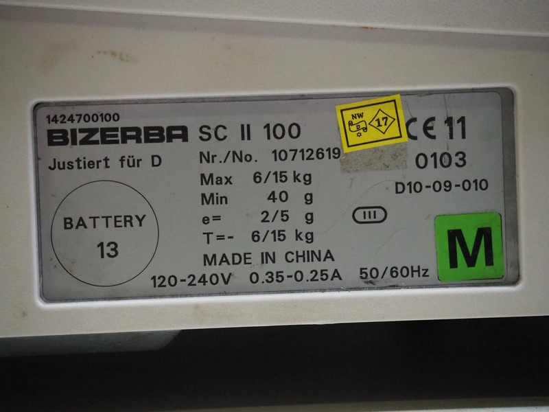 Bizerba weighing scale labelling machine with cash drawer, type: SC II 100, number: 10712619, year of construction: 2011, 120-240 V, 50/60 Hz, 0.35-0.25 A, maximum weight: 6/15 kg, minimum weight: 40 gram, e = 2/5 gram, T = - 6/15 kg, dimensions scale: 340 mm x 250 mm, total dimensions: 4200 mm x 4200 mm x 350 mm.