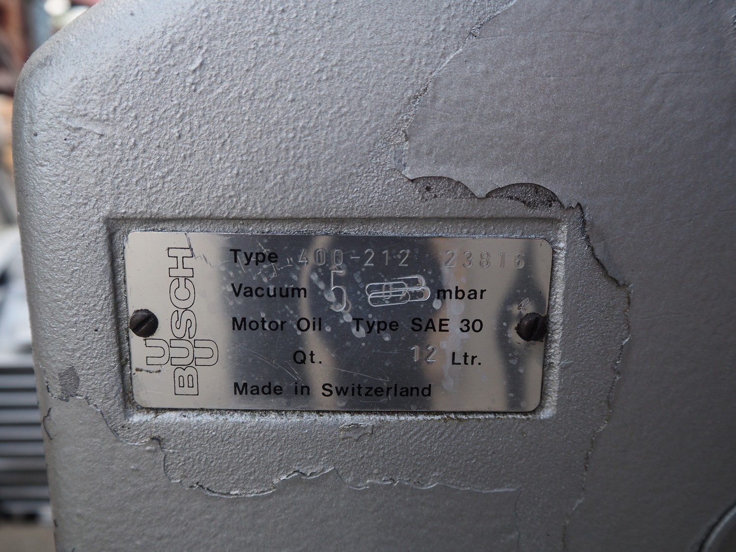 Busch vacuum pump, type: 400-212 23816, capacity: 400 m³ per hour, dimensions: 1300 mm x 850 mm x 1150 mm.