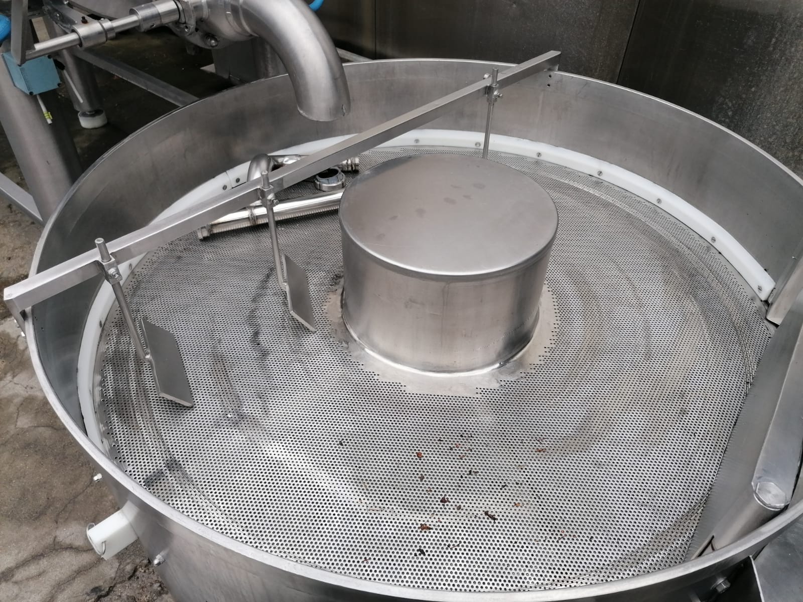 Velati scalding machine for heating and washing fat, type: SLL 1500 LL (Scalda Lava Lardello), 380 V, 50 Hz, steam heated cylindrical tank with agitators, tank capacity: 1500 liter, rotating filter in set, dimensions tank: 3000 mm x 1650 mm x 2300 mm, dimensions filter: 1800 mm x 1800 mm x 1100 mm.